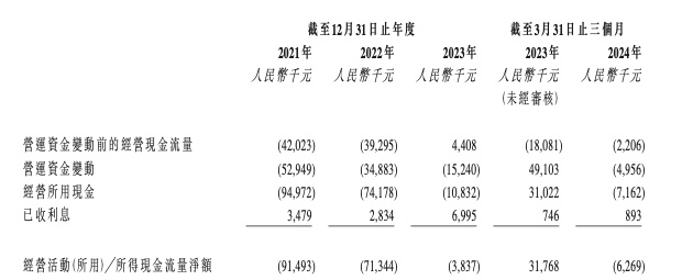 智通财经APP注意到,七牛智能不仅在经营上持续亏损,其在经营性现金流方面也持续“失血”。2021年至2024年前三个月,公司经营活动产生的现金流量金额分别为-9149.3万元、-7134.4万元、-383.7万元及-626.9万元,合计约为-1.73元。这也意味着,七牛智能从未在经营上赚到过现金,反而还合计净流出了超1.7亿元的现金。