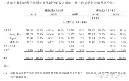 目前,新吉奥经营三个特色品牌,即:中端品牌Snowy River,豪华品牌Regent,及半越野品牌NEWGEN。其中,Snowy Rive品牌为公司销售额最大的品牌,于2024年上半年实现销售收入3.35亿元(人民币,下同),占总收入比重79.4%;其他两大品牌合计销售占比为14.7%。