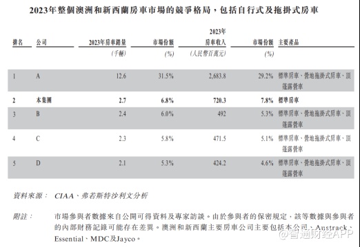 根据弗若斯特沙利文资料,按2023年的收入及销量计,新吉奥在澳洲和新西兰房车行业的市场份额中均位居第二,收入占据约7.8%的市场份额。据2023年销售数据,前五大参与者合计占据约55.4%的市场份额。同年,公司成为澳洲和新西兰第二大房车公司,销售了2700辆房车,占据约6.8%的市场份额。