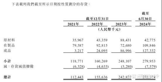 招股书显示,新吉奥房车的存货金额从2021年的1.12亿元增长到2024年上半年的2.72亿元,显示出存货规模的快速增长。截至2023年12月31日止三个年度及截至2024年6月30日止六个月,公司存货减值拨备分别为632.8万元、463.3万元、528万元及757.9万元;同期平均存货周转天数分别约为174天、122天、138天及166天。