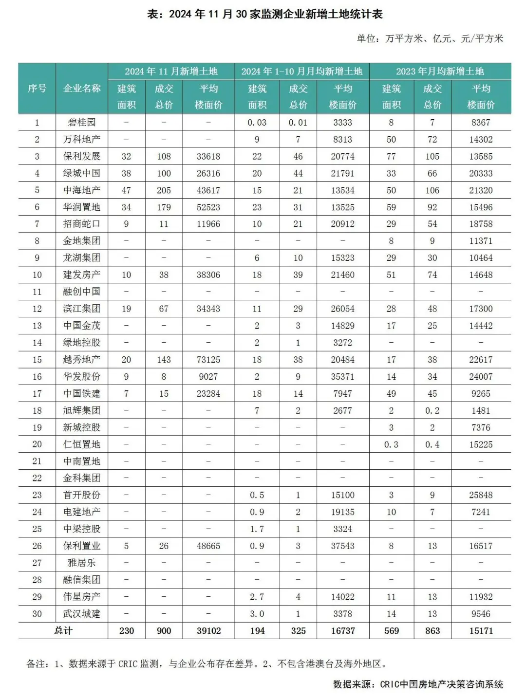 11月,在重点城市土拍带动下典型房企拿地金额大幅上涨。30家企业单月投资金额为900亿元,同环比分别增长107%和181%,创2024年以来新高;拿地面积230万平方米,环比增68%,同比降33%,由于一二线城市高总价、小面积地块成交较多所致。相应的。核心城市拍地带动11月成交楼板价继续上涨,达39102元/平方米,较10月份提升67%。