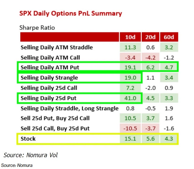 野村证券跨资产策略师Charlie McElligott在一份报告中表示,每天系统地做空标普500指数看跌期权和和套期保值期权比单纯买入股票更有吸引力。他补充说,这些期权策略的夏普比率(衡量风险回报的指标)已升至约19点,而持有股票策略的夏普比率为15点。