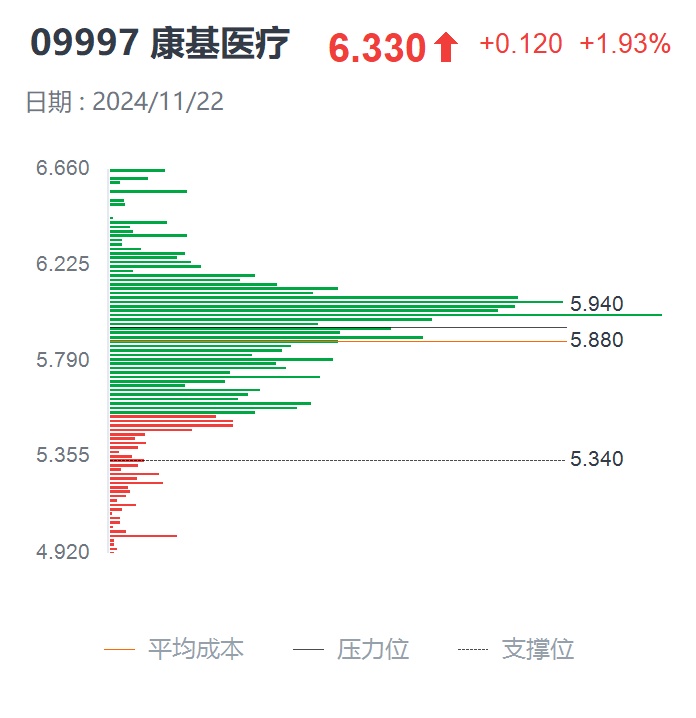 在1个月的调整中,康基医疗不少散户选择割肉,交出带血筹码,而筹码峰也逐渐在成本线附近出现单峰聚集。此时,70%的筹码集中在5.60-6.12港元区间,获利比例再次压至11.20%。可以看到,11月21日,康基医疗的市场成交量明显变小,仅23.75万股,与前后两个交易日动辄上百万股的成交量形成鲜明对比,侧面说明此时市场抛单少,大部分筹码被主力锁定。