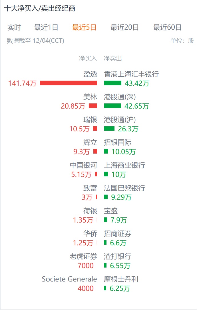 虽然盈透证券是康基医疗近5日和20日以来最大的买方,但在12月4日和5日这最近两个交易日,花旗银行和中信里昂则交替登上买方第一席,分别买入75.32万股和85.20万股。