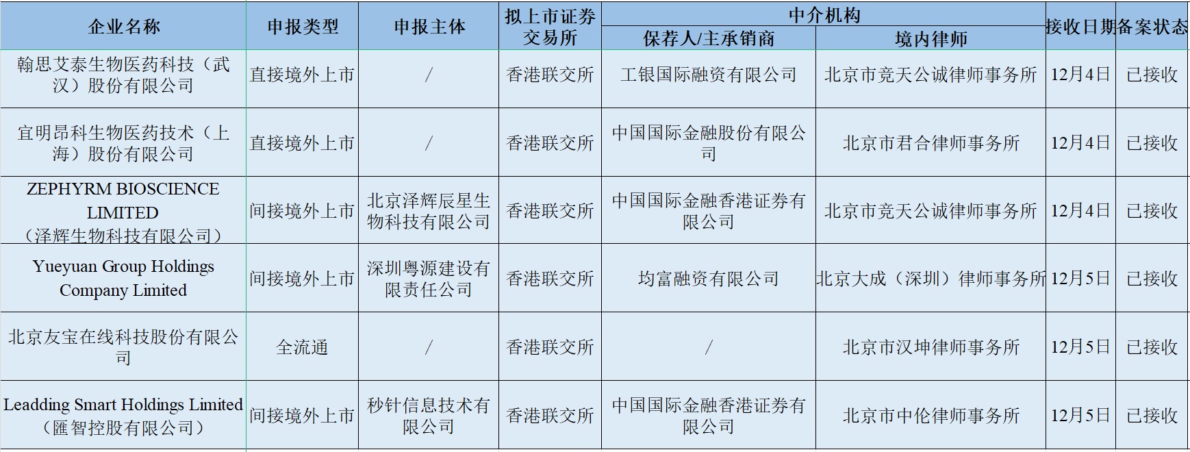 智通财经APP获悉,12月6日,中国证监会发布《境内企业境外发行证券和上市备案情况表(首次公开发行及全流通)(截至2024年12月5日)》。本周(12月2日-6日),翰思艾泰、泽辉生物、粤源建设、汇智控股等公司拟香港IPO获中国证监会接收材料。