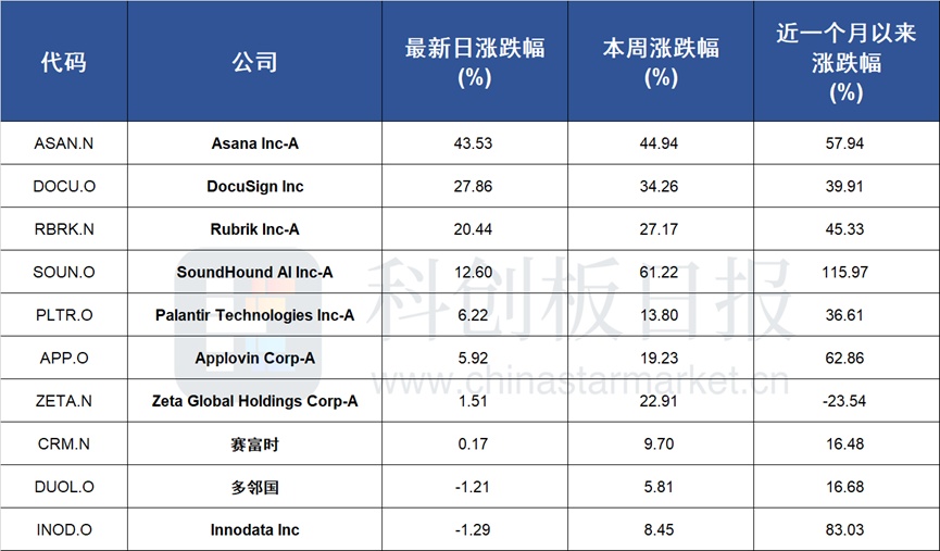 美东时间周五,AI应用板块多股进一步上涨:Asana涨超43%、Docusign张近28%、Rubrik涨超20%。无一例外地,涨幅领跑的三只个股都刚刚在日前交出了极为亮眼的财报数据。