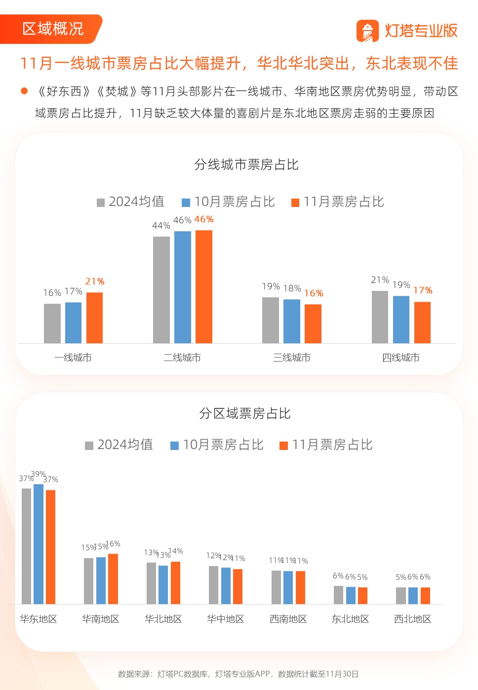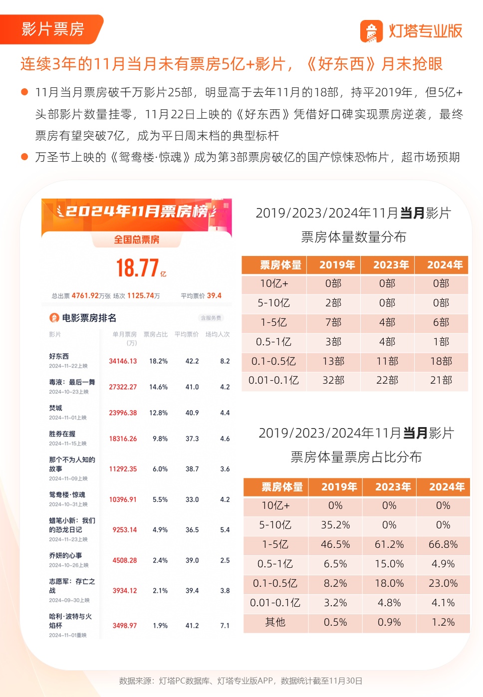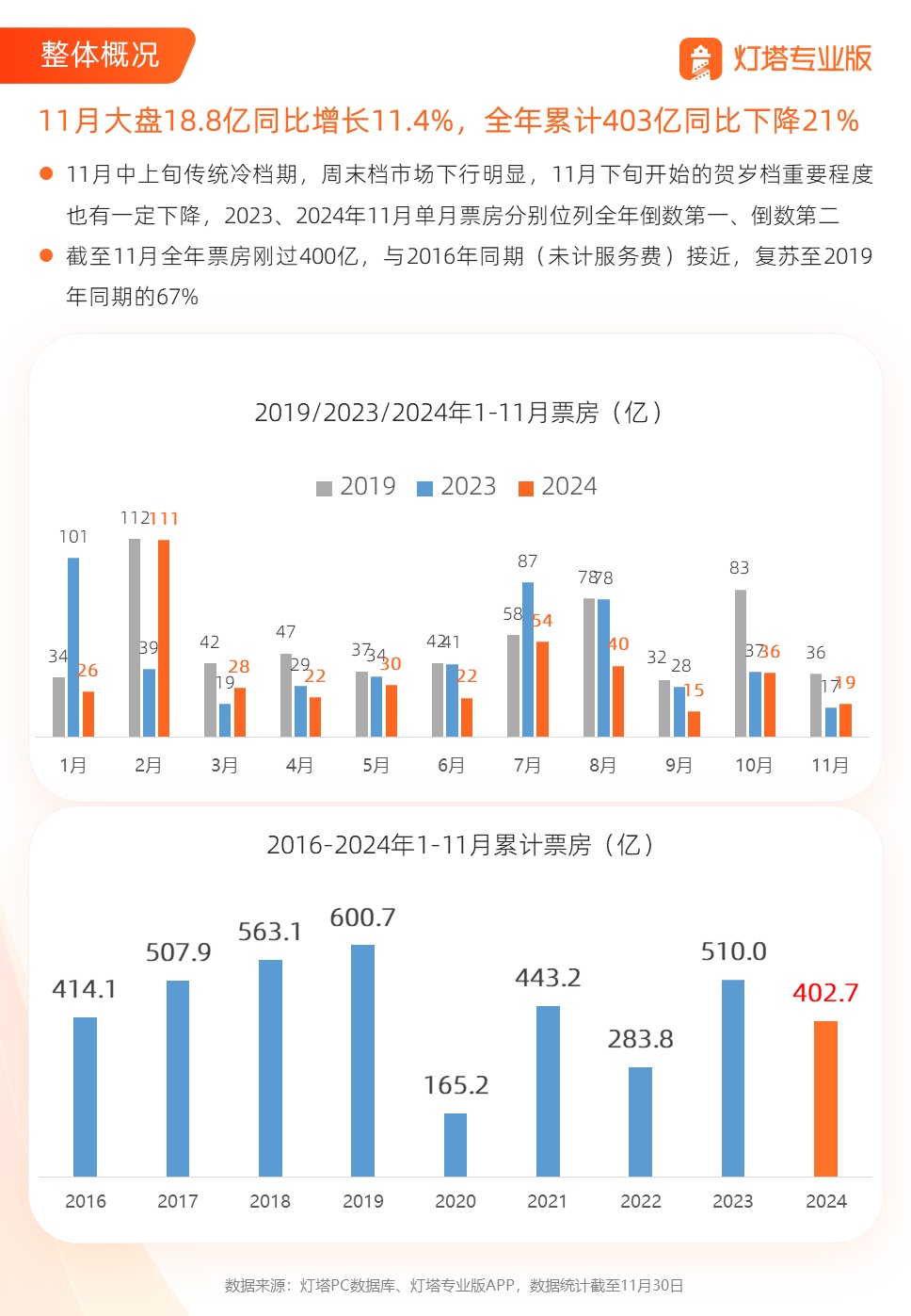 报告指,11月中上旬是传统冷档期,周末档市场下行明显,11月下旬开始的贺岁档重要程度也有一定下降,2023、2024年11月单月票房分别位列全年倒数第一、倒数第二。截至11月全年票房刚过400亿,与2016年同期(未计服务费)接近,复苏至2019年同期的67%。