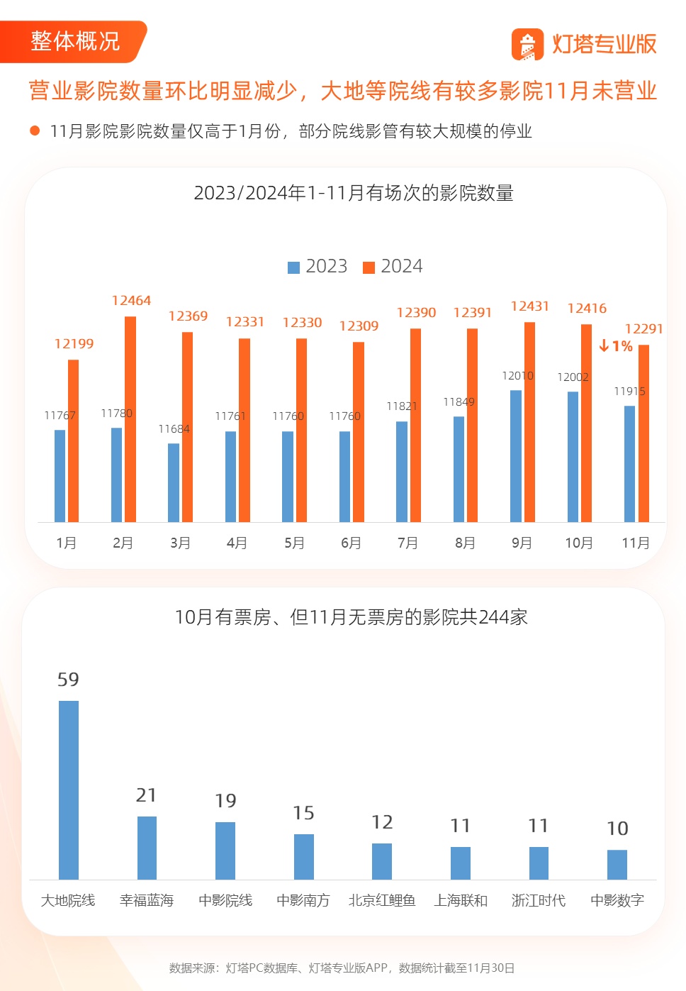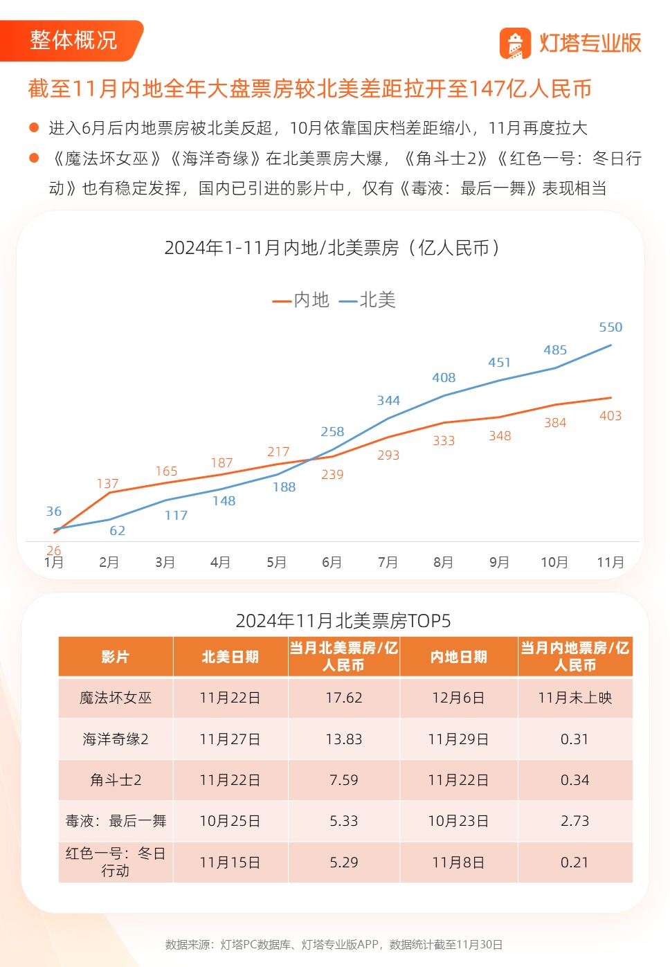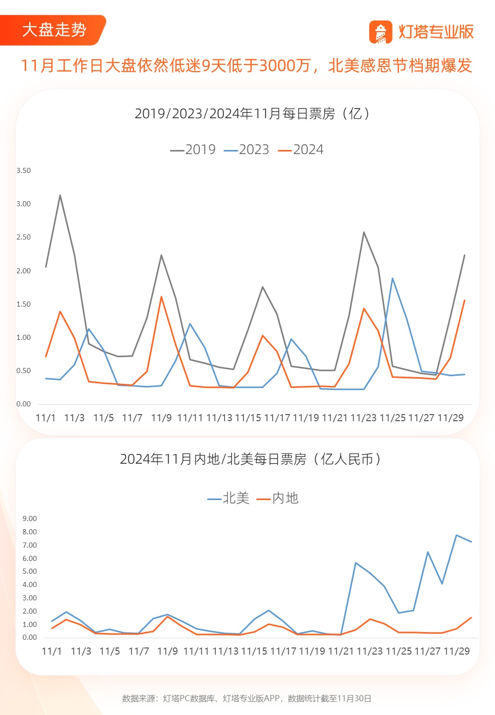 报告指,11月中上旬是传统冷档期,周末档市场下行明显,11月下旬开始的贺岁档重要程度也有一定下降,2023、2024年11月单月票房分别位列全年倒数第一、倒数第二。截至11月全年票房刚过400亿,与2016年同期(未计服务费)接近,复苏至2019年同期的67%。