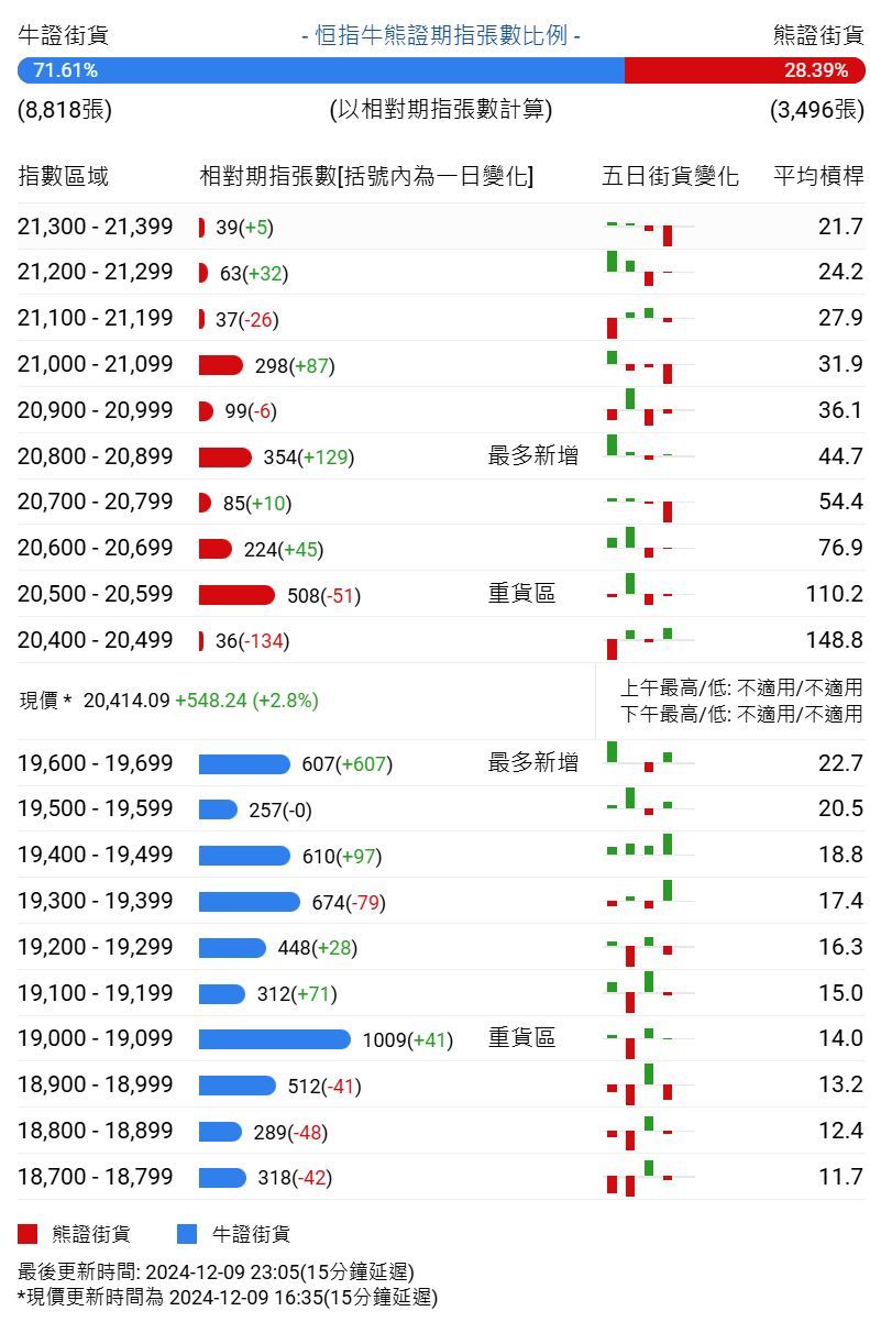 中信证券牛熊证街货分布图中的数据显示,熊证街货重货区在20500 - 20599区间,该区间最新熊证数量为508张,较上一交易日减少51张;最多新增在20800 - 20899区间,该区间最新熊证数量为354张,较上一交易日增加129张。