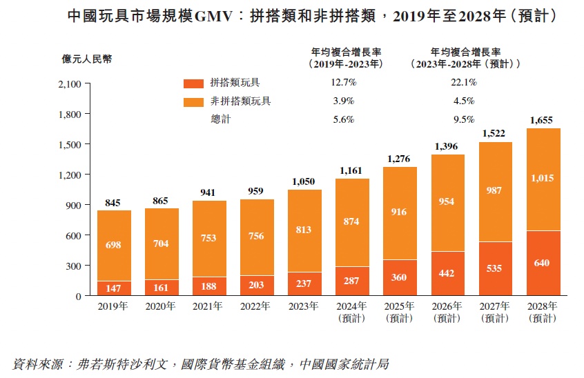而若暂且抛开二级市场的主题投资不论,置于行业视角下,布鲁可也确实颇具看点。数据显示,作为玩具市场中高速增长的细分市场,2019-2023年中国拼搭类玩具的GMV年均复合增长率高达12.7%,增速表现远高于非拼搭类玩具;另据预测,2023-2028年国内拼搭类玩具的CAGR为22.1%,增速还将进一步提升,至2028年这一市场的规模有望扩容至640亿元。