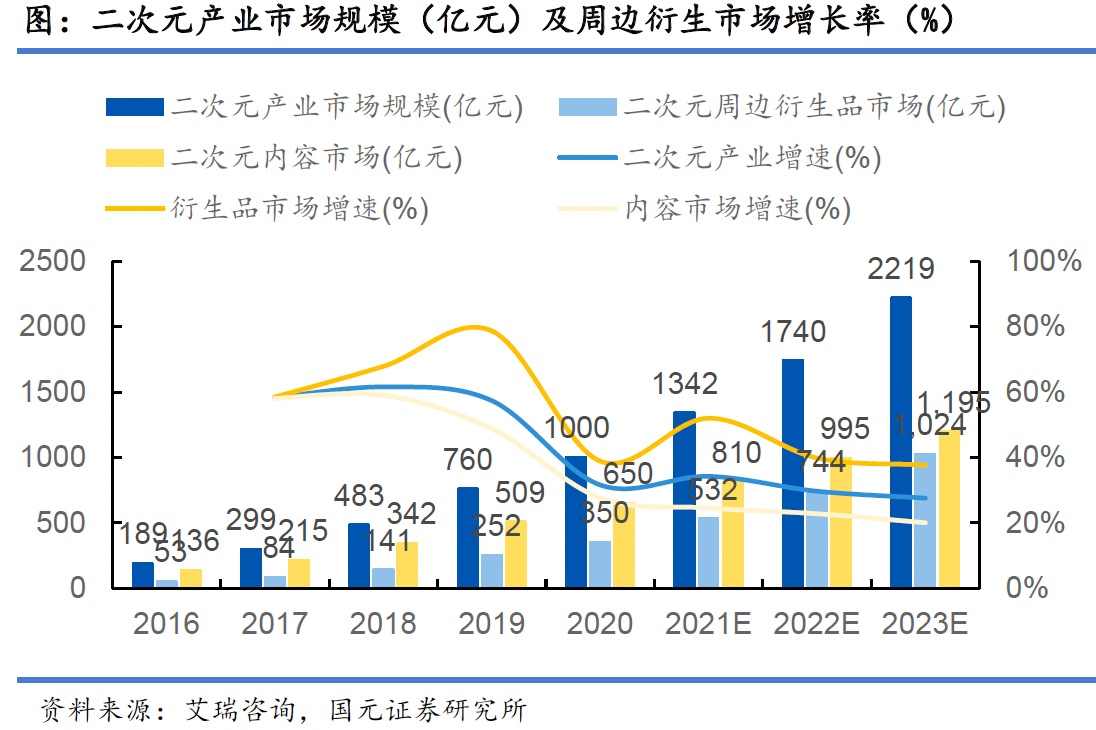 行业本就潜力十足,而这些年热度愈发升高的二次元消费抑或为拼搭类玩具市场再添一把火。根据艾瑞的数据,预计2023年二次元市场规模由2016年的189亿增长至2219亿,2016-2023年复合增速为42.17%。其中,二次元周边衍生市场由2016年的53亿增长到2023年的1024亿元,2016-2023年复合增速高达52.66%。