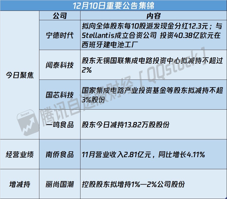 1、宁德时代:拟向全体股东每10股派发现金分红12.3元;与Stellantis成立合资公司 投资40.38亿欧元在西班牙建电池工厂