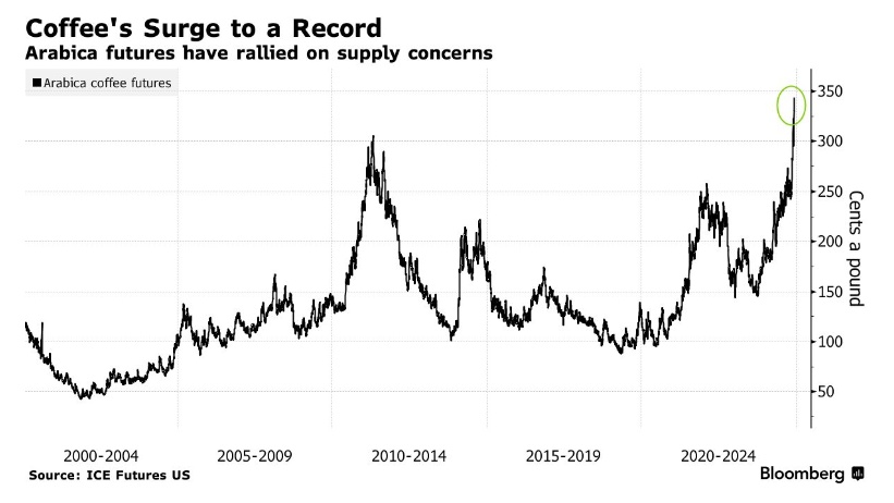 在纽约期货交易所,阿拉比卡咖啡期货价格上涨4%,至每磅3.434美元。价格超过了1977年曾经创下的历史新高,当时巴西1975年毁灭性的霜冻期货影响了未来一段的咖啡作物,大宗商品市场受到剧烈冲击。