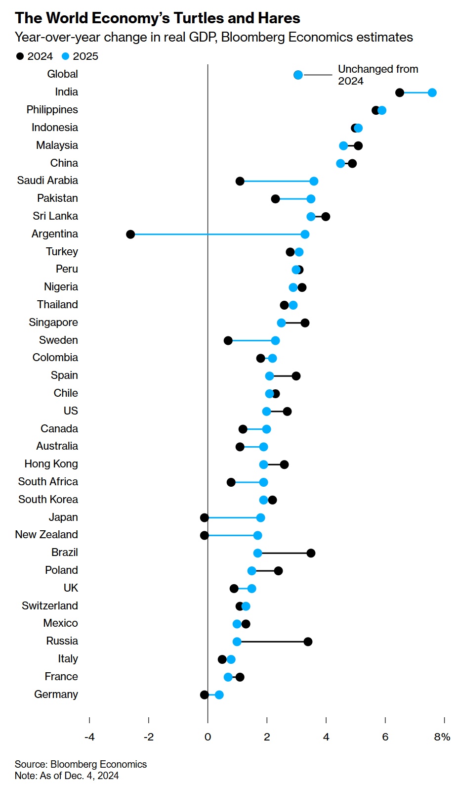 这场大火需要一段时间才能燃烧起来,原因很简单,任何一届政府都只能这么快地实施其待办事项清单。彭博经济预测,未来一年全球经济增长率为3.1%,与2024年持平。通胀率将从6%降至3.4%,美国和其他发达经济体的通胀率将回落至央行长期以来设定的2%的目标。