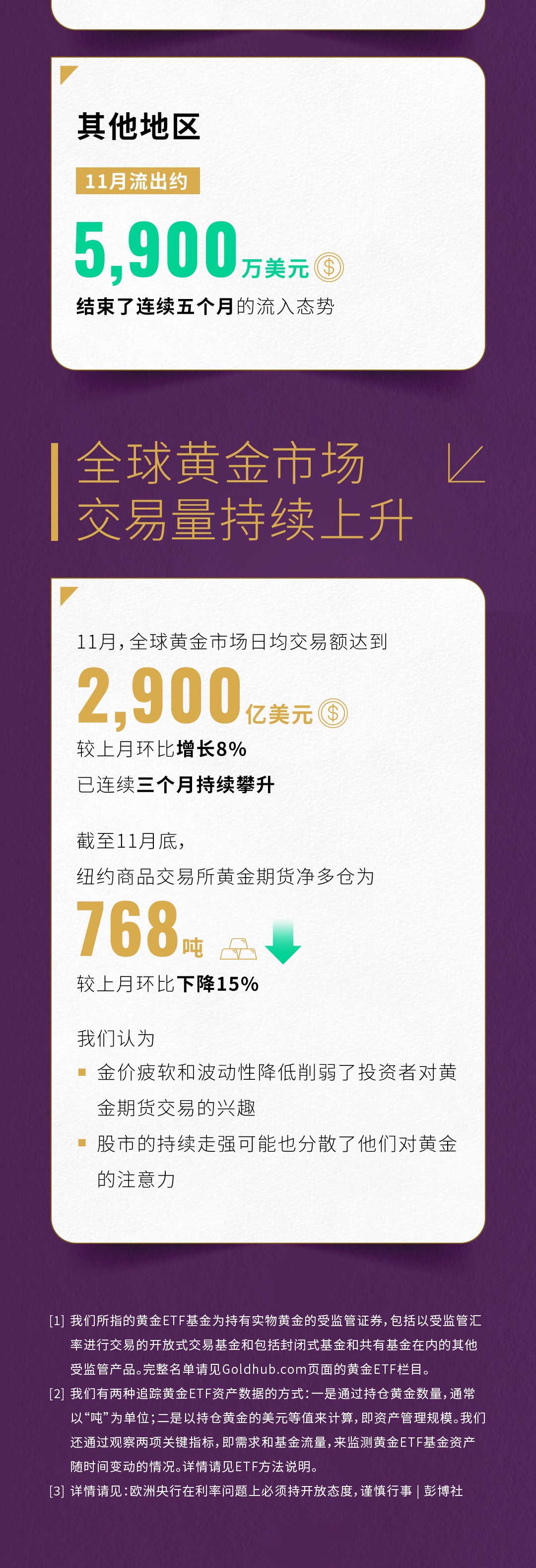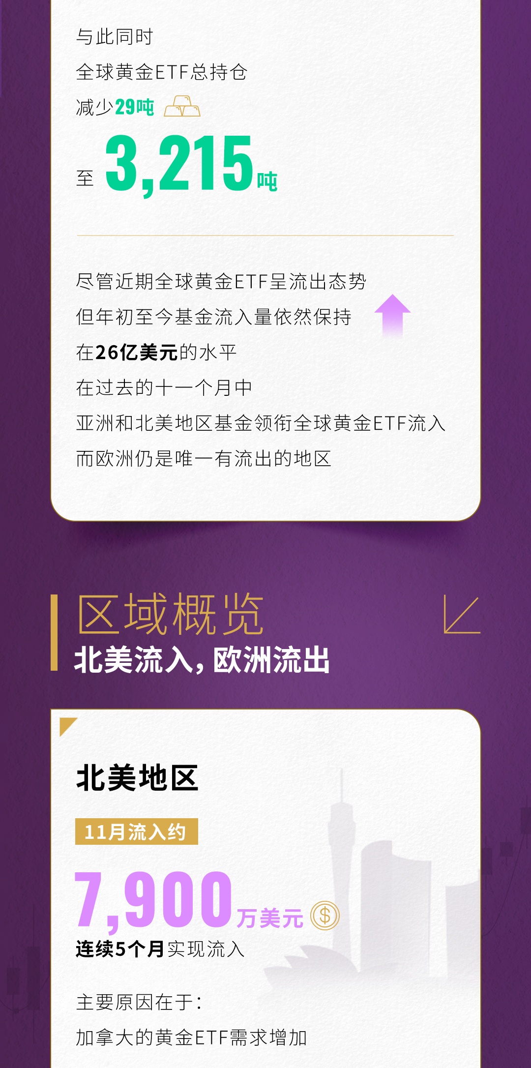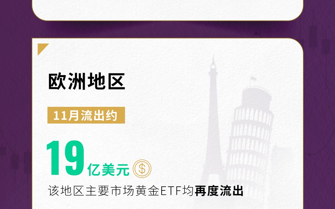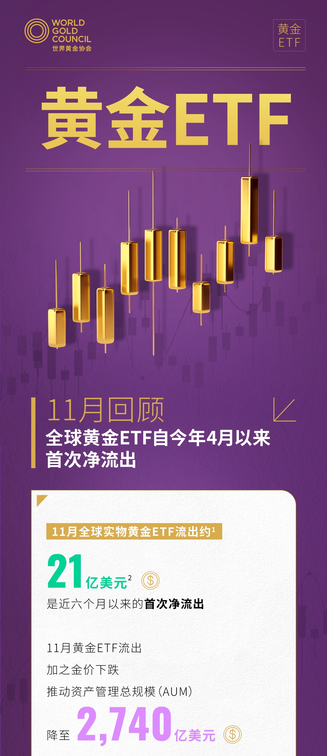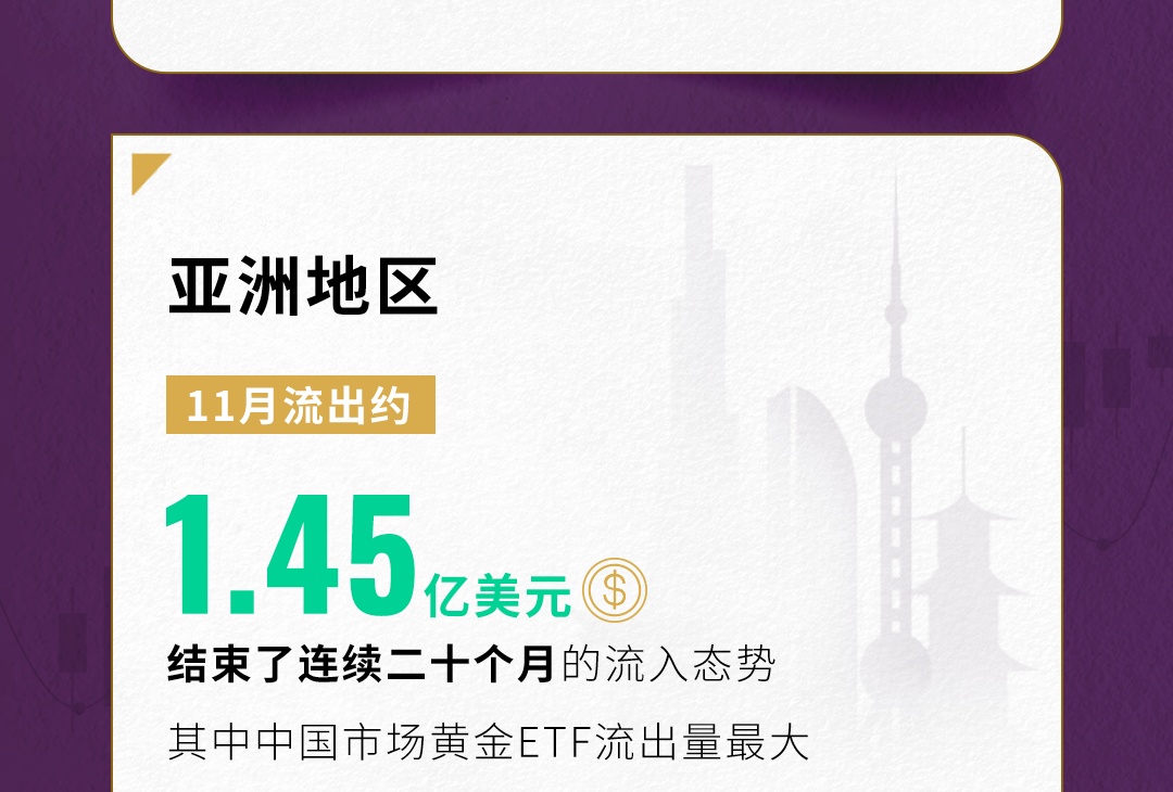 智通财经APP获悉,据世界黄金协会,11月全球实物黄金ETF流出约21亿美元,是近六个月以来首次净流出。11月黄金ETF流出加之金价下跌推动资产管理总规模(AUM)降至2740亿美元,与此同时全球黄金ETF总持仓减少29吨至3215吨。尽管近期全球黄金ETF呈流出态势,但年初至今基金流入量依然保持在26亿美元的水平,在过去的十一个月中,亚洲和北美地区基金领衔全球黄金ETF流入,而欧洲仍是唯一有流出的地区。
