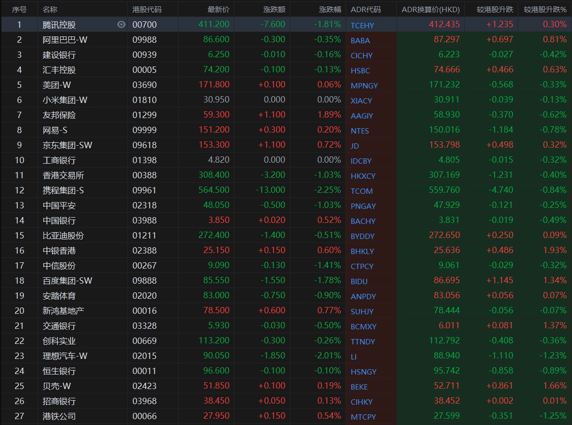 智通财经APP获悉,周二美股三大指数齐跌,恒生指数ADR下跌,按比例计算,收报20298.57点,较香港收市下跌12.71点或0.06%。