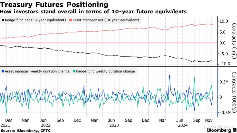 在截至12月3日当周,资产管理公司增加了美国国债期货的净多头头寸,而对冲基金则回补了净空头头寸。在SOFR期货中,两种类型的投资者均回补了净多头头寸,自7月以来首次转为净空头头寸。