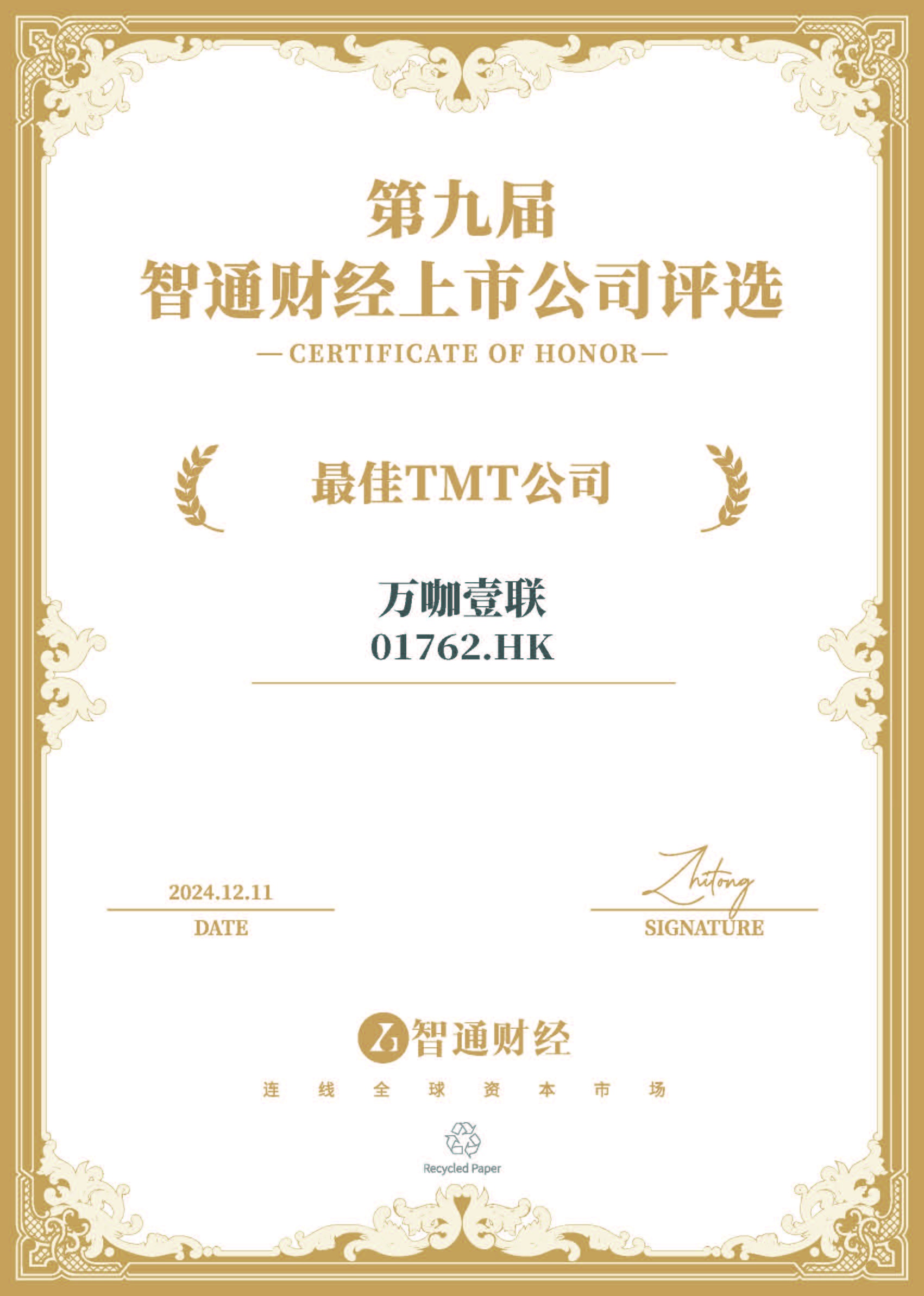 2024年12月11日,万咖壹联(01762)在备受瞩目的“第九届智通财经资本市场年会暨上市公司颁奖典礼”上荣获“最佳TMT公司”。这一盛会由国内领先的港美股资讯平台智通财经与中资海外私募基金一站式服务平台新智基金网联合主办,并由财经公关综合服务提供商冬日暖阳Donova独家承办,同时得到了专业财经路演直播平台“大路演”提供的路演支持。