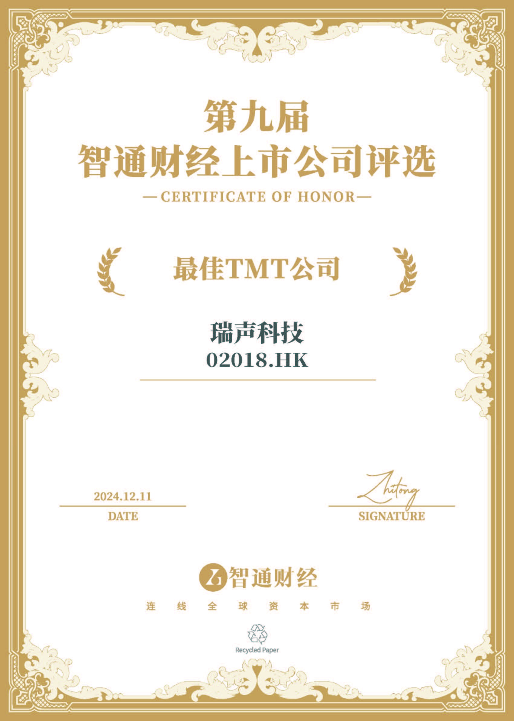 2024年12月11日,瑞声科技(02018)在备受瞩目的“第九届智通财经资本市场年会暨上市公司颁奖典礼”上荣获“最佳TMT公司”。这一盛会由国内领先的港美股资讯平台智通财经与中资海外私募基金一站式服务平台新智基金网联合主办,并由财经公关综合服务提供商冬日暖阳Donova独家承办,同时得到了专业财经路演直播平台“大路演”提供的路演支持。