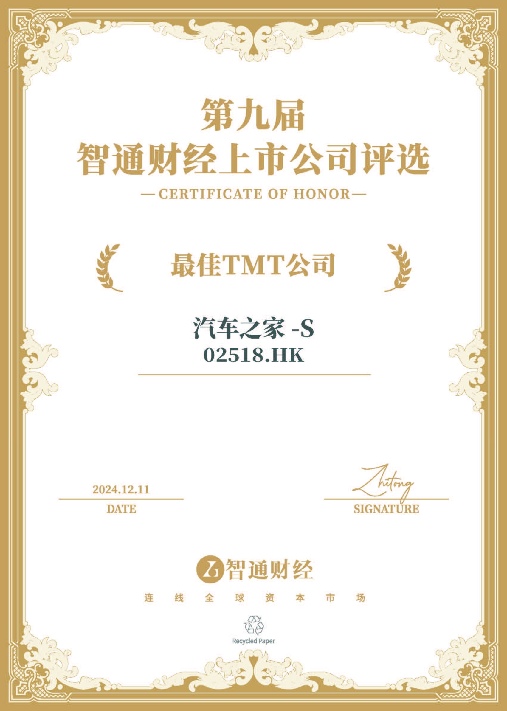 “最佳TMT公司”奖项,其主要表彰公司治理结构健康、行业地位显著、主营业务良好,能为投资者提供持续、稳定价值回报的TMT(Technology、Media、Telecom)类港美股上市公司。汽车之家-S的此次获奖,不仅彰显了业界和投资者的高度关注与认可,也是对公司极大的鼓励与鞭策。我们期待获奖上市公司再接再厉,为社会可持续发展与高质量增长贡献更多力量。