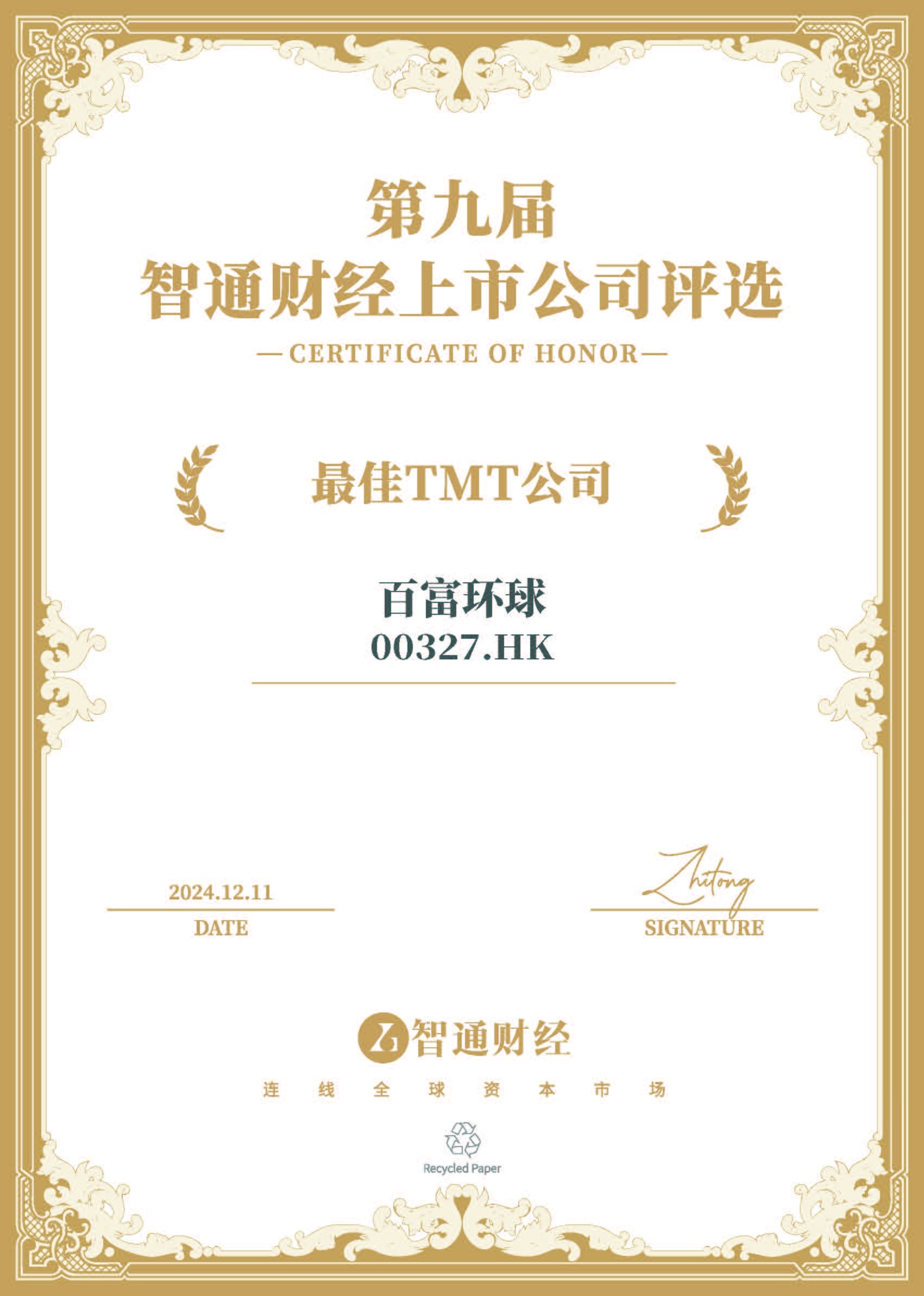 “最佳TMT公司”奖项,其主要表彰公司治理结构健康、行业地位显著、主营业务良好,能为投资者提供持续、稳定价值回报的TMT(Technology、Media、Telecom)类港美股上市公司。百富环球的此次获奖,不仅彰显了业界和投资者的高度关注与认可,也是对公司极大的鼓励与鞭策。我们期待获奖上市公司再接再厉,为社会可持续发展与高质量增长贡献更多力量。