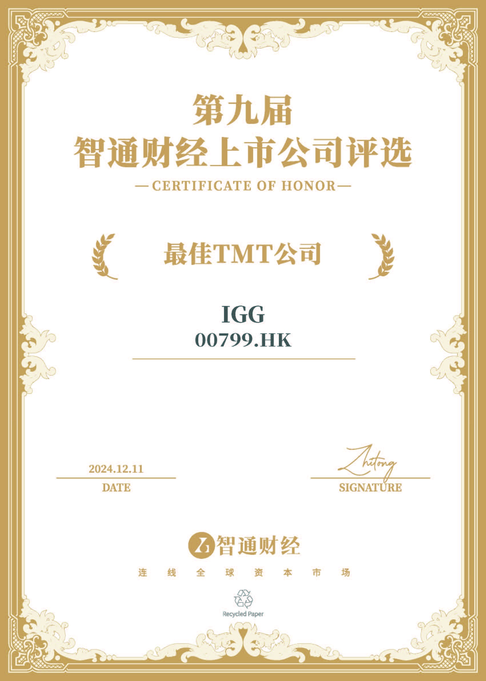 2024年12月11日,IGG(00799)在备受瞩目的“第九届智通财经资本市场年会暨上市公司颁奖典礼”上荣获“最佳TMT公司”。这一盛会由国内领先的港美股资讯平台智通财经与中资海外私募基金一站式服务平台新智基金网联合主办,并由财经公关综合服务提供商冬日暖阳Donova独家承办,同时得到了专业财经路演直播平台“大路演”提供的路演支持。