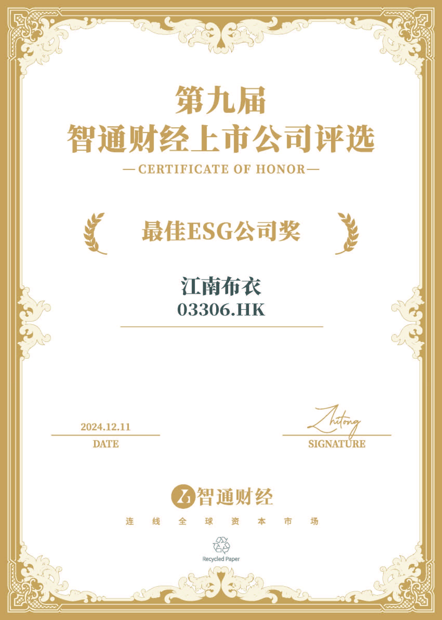 2024年12月11日,江南布衣(03306)在备受瞩目的“第九届智通财经资本市场年会暨上市公司颁奖典礼”上荣获“最佳ESG公司奖”。这一盛会由国内领先的港美股资讯平台智通财经与中资海外私募基金一站式服务平台新智基金网联合主办,并由财经公关综合服务提供商冬日暖阳Donova独家承办,同时得到了专业财经路演直播平台“大路演”提供的路演支持。