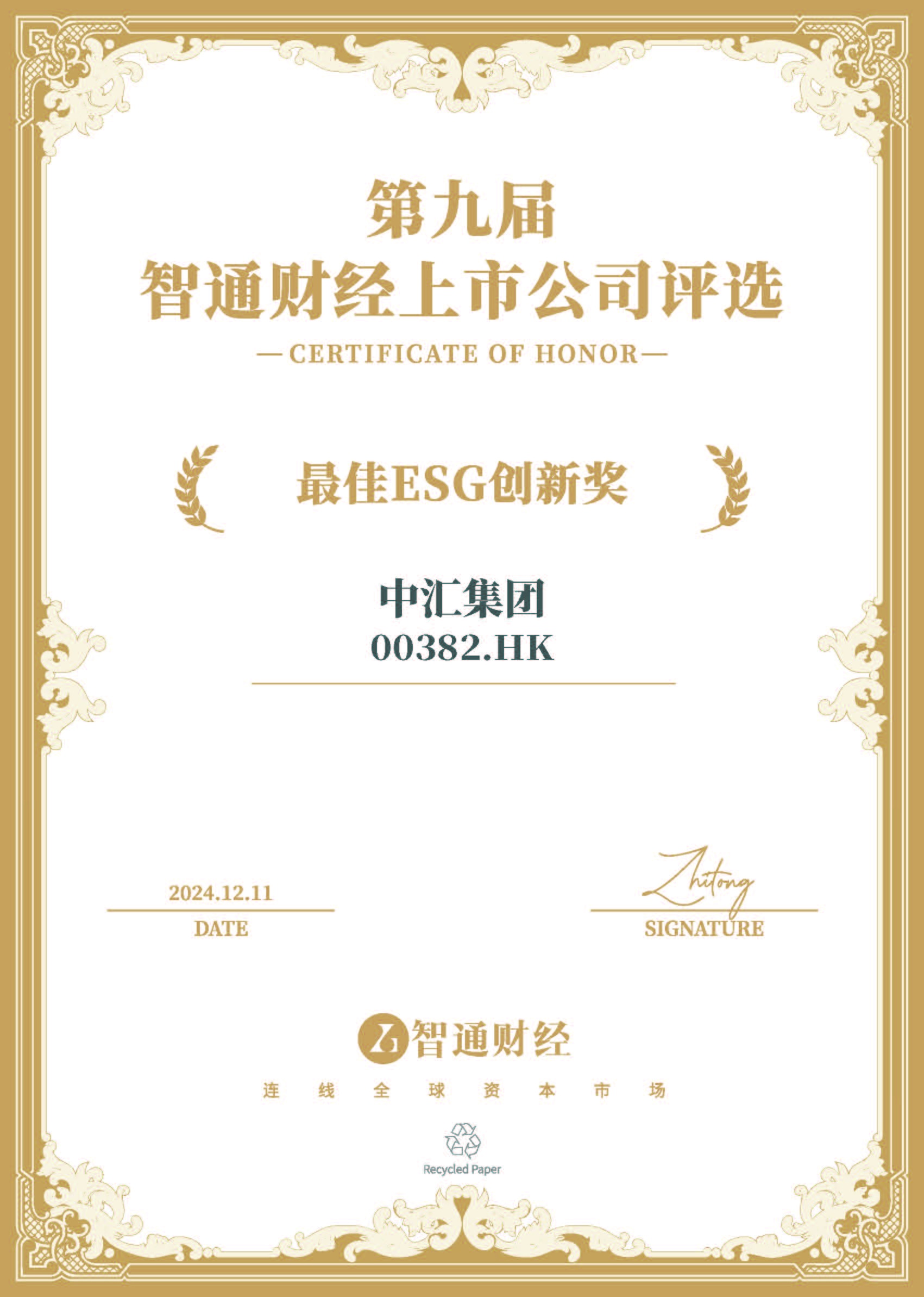 2024年12月11日,中汇集团(00382)在备受瞩目的“第九届智通财经资本市场年会暨上市公司颁奖典礼”上荣获“最佳ESG创新奖”。这一盛会由国内领先的港美股资讯平台智通财经与中资海外私募基金一站式服务平台新智基金网联合主办,并由财经公关综合服务提供商冬日暖阳Donova独家承办,同时得到了专业财经路演直播平台“大路演”提供的路演支持。