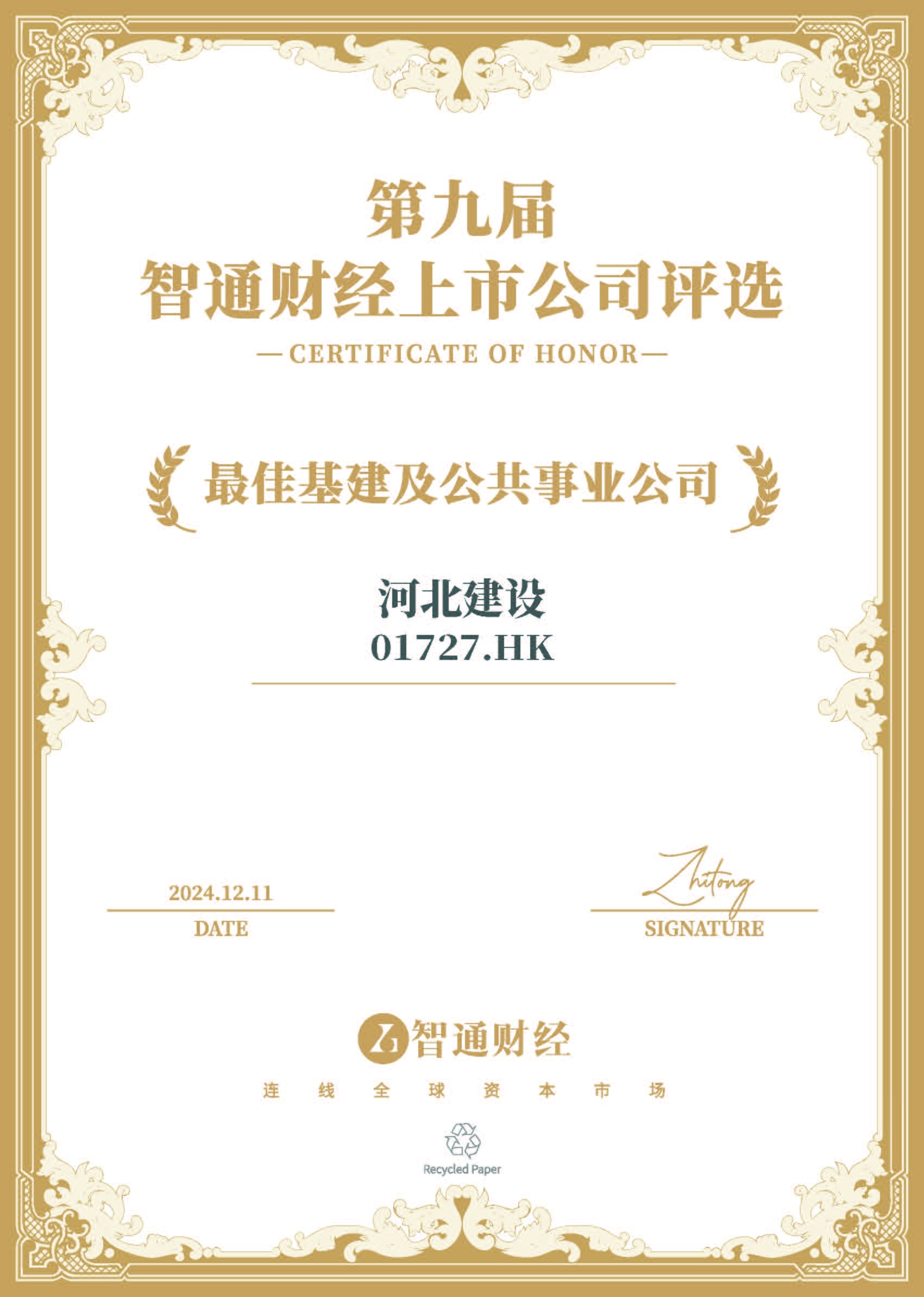 2024年12月11日,河北建设(01727)在备受瞩目的“第九届智通财经资本市场年会暨上市公司颁奖典礼”上荣获“最佳基建及公共事业公司”。这一盛会由国内领先的港美股资讯平台智通财经与中资海外私募基金一站式服务平台新智基金网联合主办,并由财经公关综合服务提供商冬日暖阳Donova独家承办,同时得到了专业财经路演直播平台“大路演”提供的路演支持。