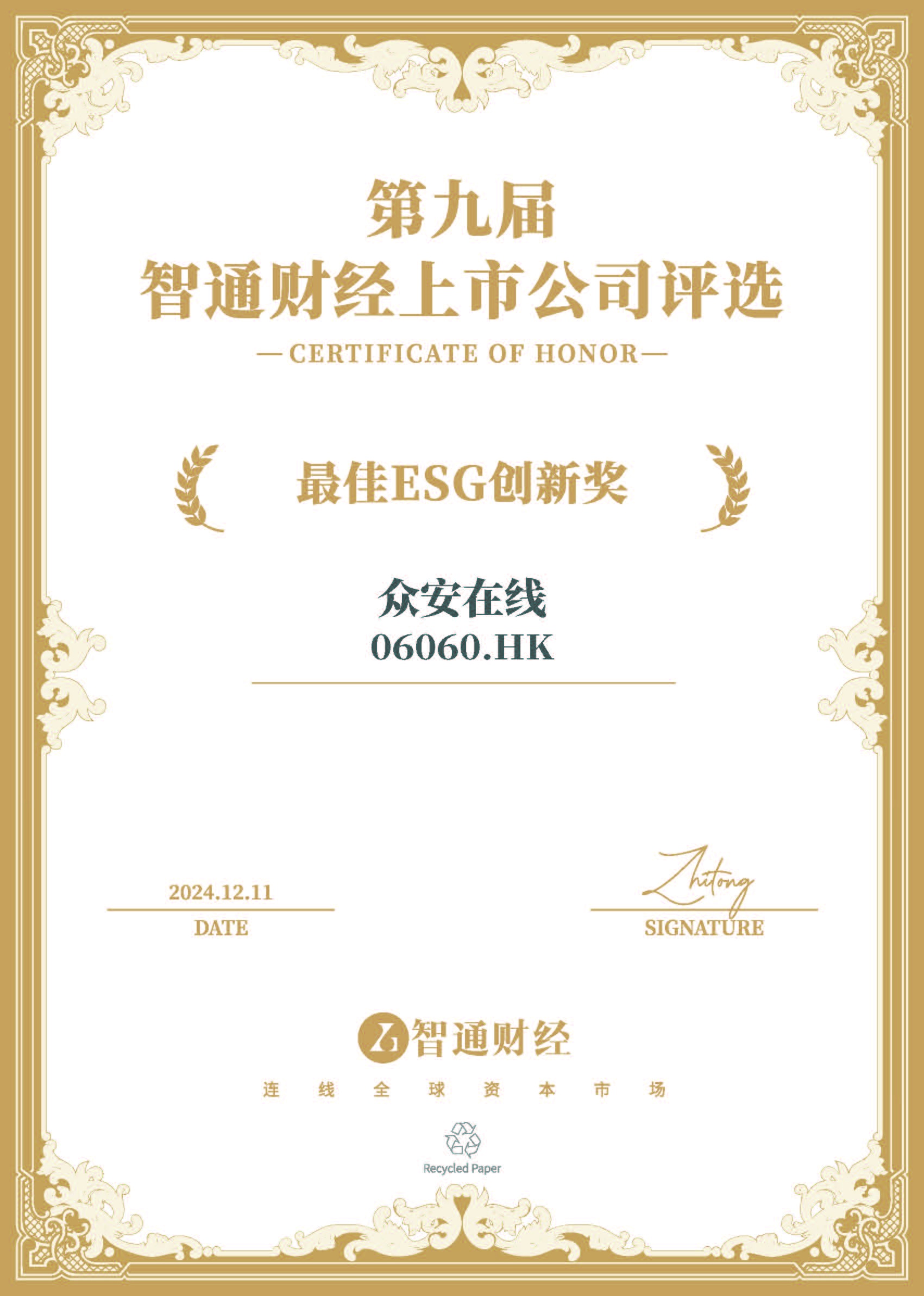 2024年12月11日,众安在线(06060)在备受瞩目的“第九届智通财经资本市场年会暨上市公司颁奖典礼”上荣获“最佳ESG创新奖”。这一盛会由国内领先的港美股资讯平台智通财经与中资海外私募基金一站式服务平台新智基金网联合主办,并由财经公关综合服务提供商冬日暖阳Donova独家承办,同时得到了专业财经路演直播平台“大路演”提供的路演支持。