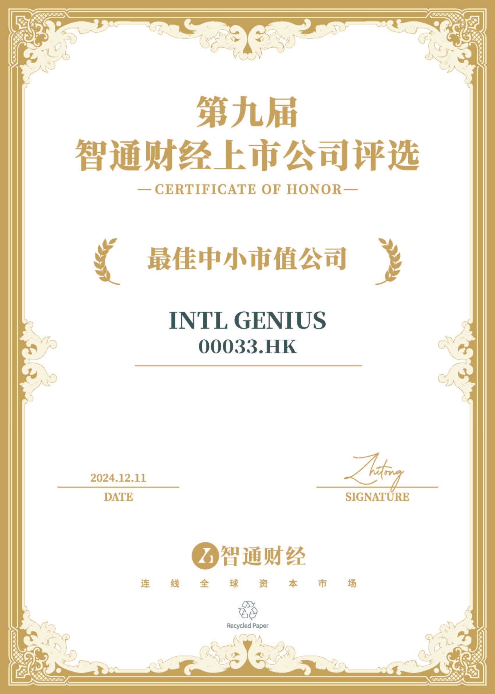 2024年12月11日,INTL GENIUS(00033)在备受瞩目的“第九届智通财经资本市场年会暨上市公司颁奖典礼”上荣获“最佳中小市值公司”。这一盛会由国内领先的港美股资讯平台智通财经与中资海外私募基金一站式服务平台新智基金网联合主办,并由财经公关综合服务提供商冬日暖阳Donova独家承办,同时得到了专业财经路演直播平台“大路演”提供的路演支持。