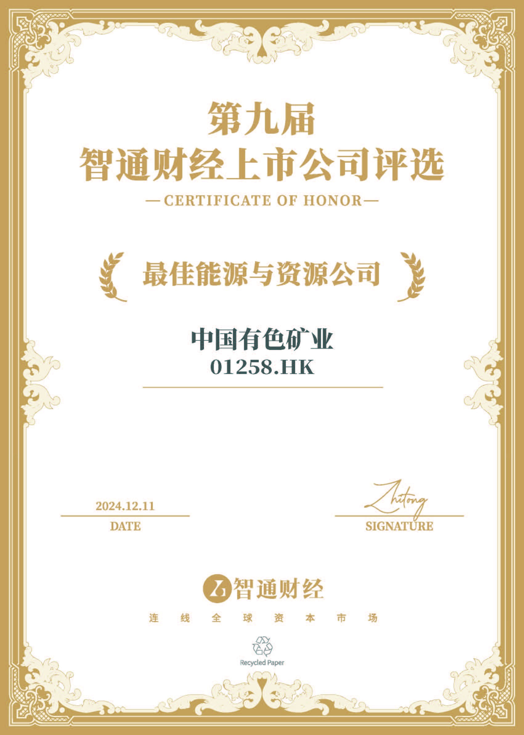 “最佳能源与资源公司”奖项,其主要表彰公司治理结构健康、行业地位显著、主营业务良好,能为投资者提供持续、稳定价值回报的能源与资源类港美股上市公司。中国有色矿业的此次获奖,不仅彰显了业界和投资者的高度关注与认可,也是对公司极大的鼓励与鞭策。我们期待获奖上市公司再接再厉,为社会可持续发展与高质量增长贡献更多力量。