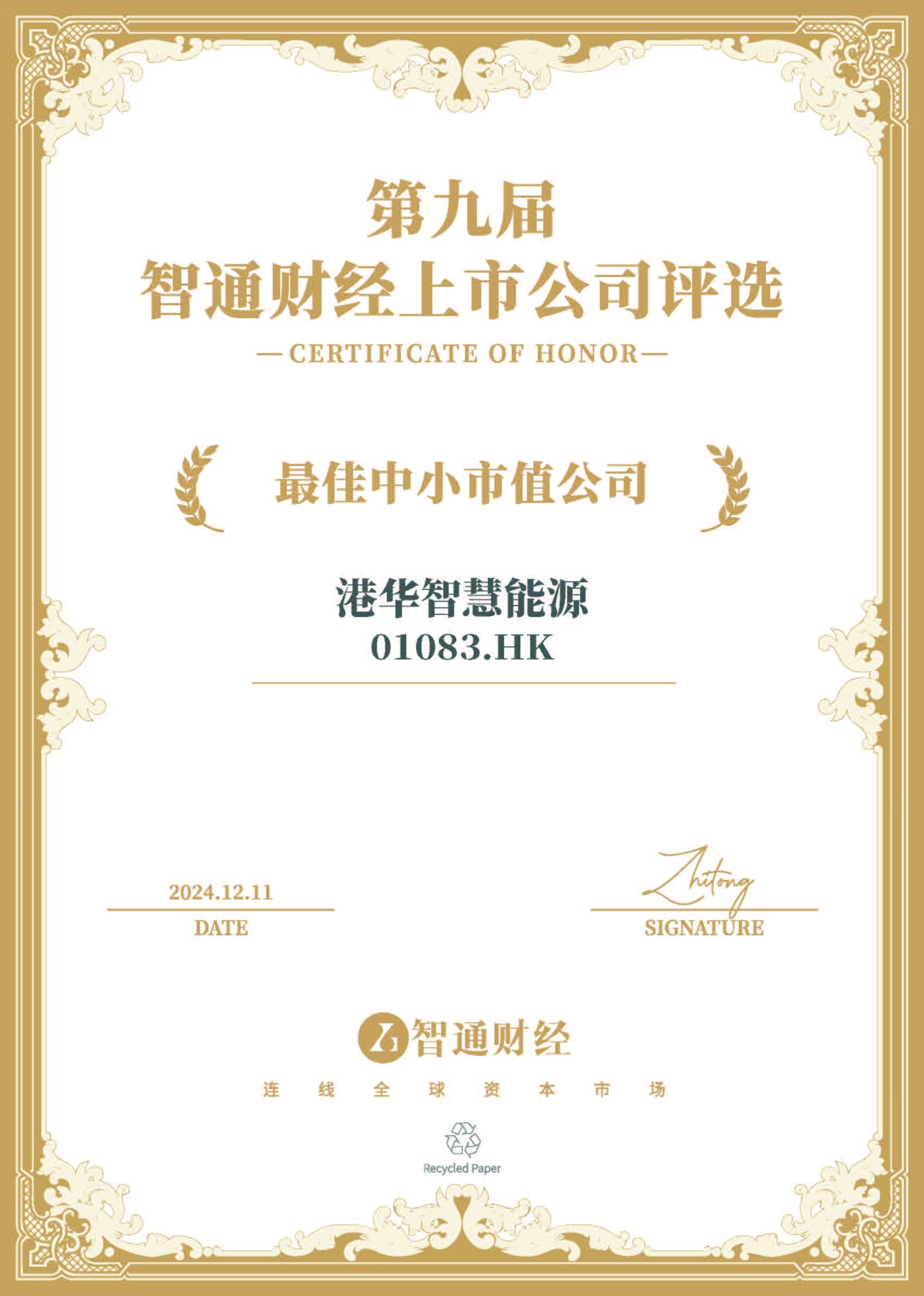 2024年12月11日,港华智慧能源(01083)在备受瞩目的“第九届智通财经资本市场年会暨上市公司颁奖典礼”上荣获“最佳中小市值公司”。这一盛会由国内领先的港美股资讯平台智通财经与中资海外私募基金一站式服务平台新智基金网联合主办,并由财经公关综合服务提供商冬日暖阳Donova独家承办,同时得到了专业财经路演直播平台“大路演”提供的路演支持。