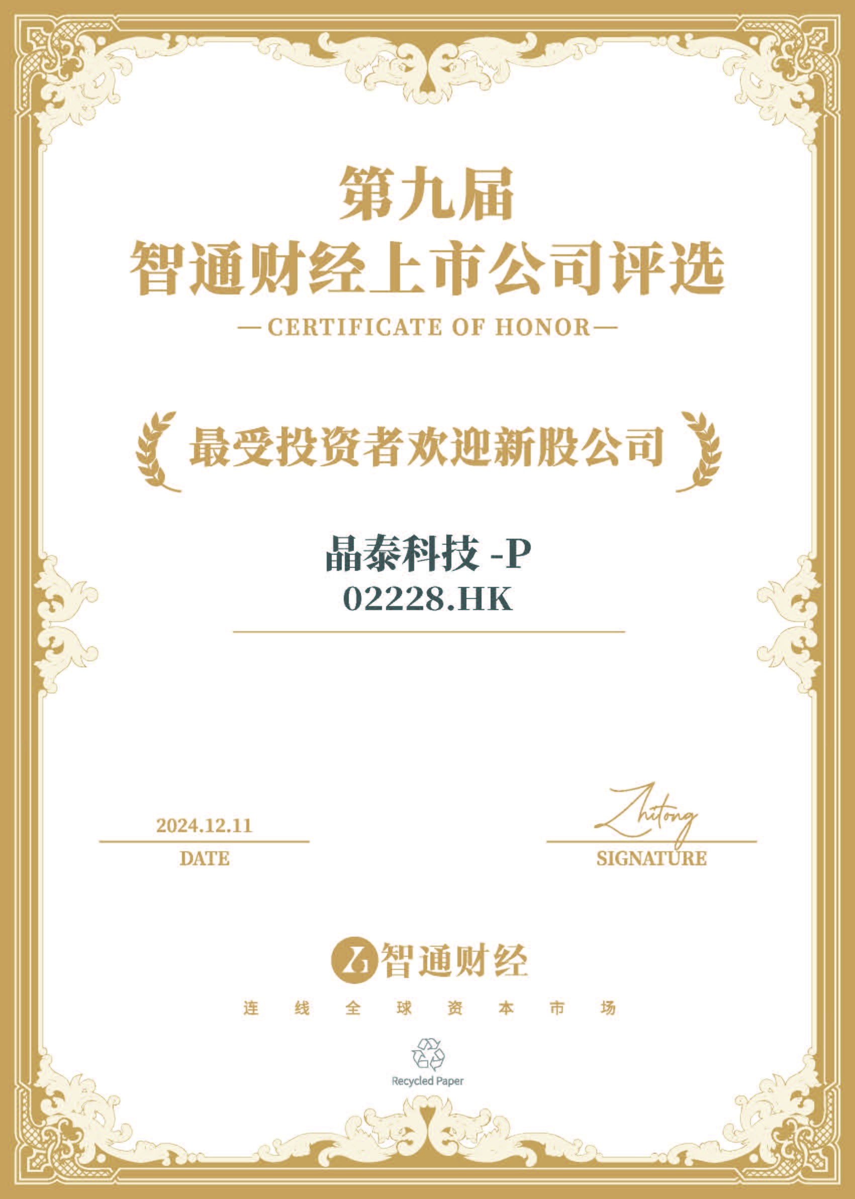 “最受投资者欢迎新股公司”奖项,其主要表彰业界关注度高、投资者积极参与、市场表现良好的港美股新股上市公司。(新股上市公司界定标准为2024年1月1日后上市交易的港美股公司)。晶泰科技-P的此次获奖,不仅彰显了业界和投资者的高度关注与认可,也是对公司极大的鼓励与鞭策。我们期待获奖上市公司再接再厉,为社会可持续发展与高质量增长贡献更多力量。