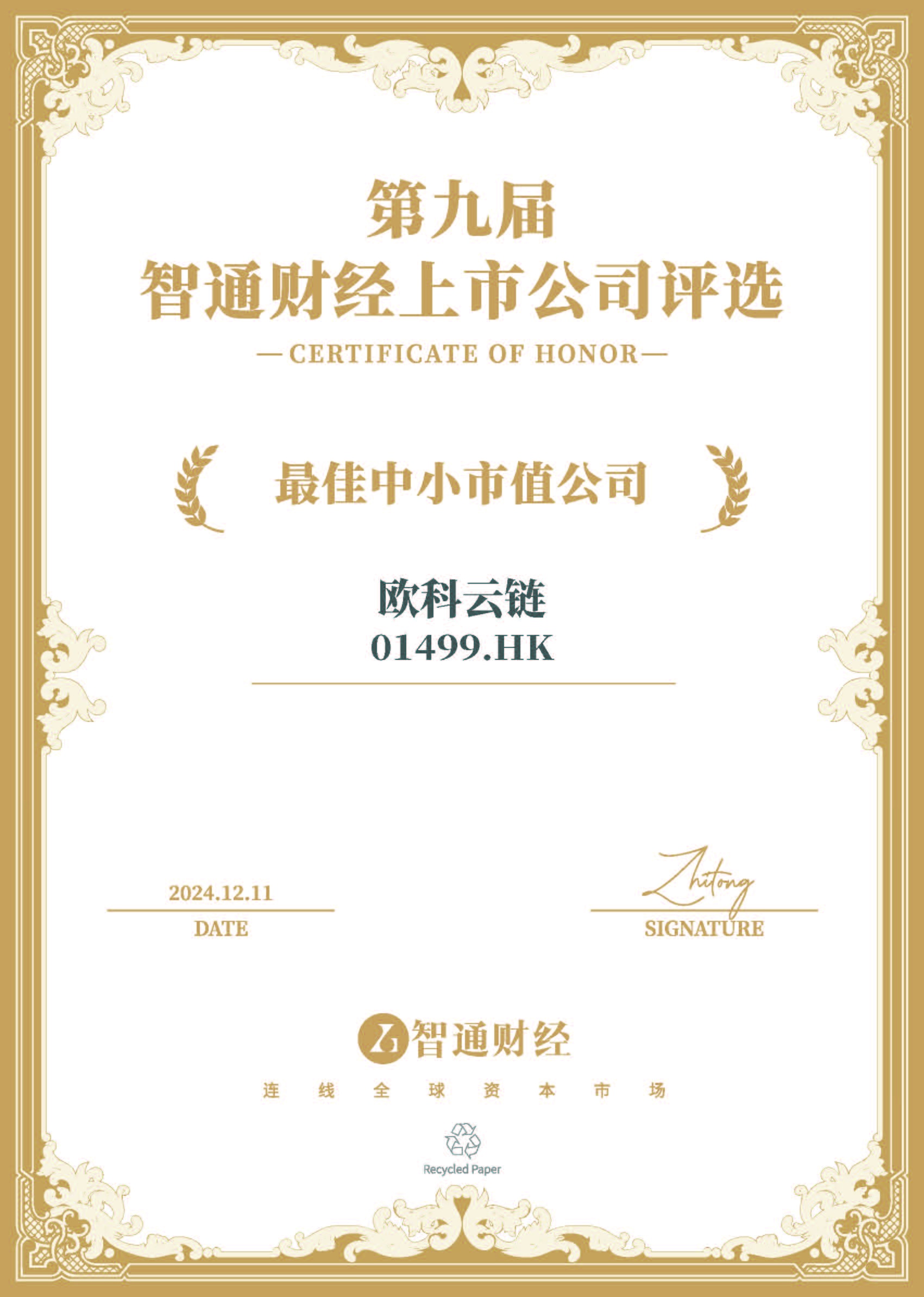 2024年12月11日,欧科云链(01499)在备受瞩目的“第九届智通财经资本市场年会暨上市公司颁奖典礼”上荣获“最佳中小市值公司”。这一盛会由国内领先的港美股资讯平台智通财经与中资海外私募基金一站式服务平台新智基金网联合主办,并由财经公关综合服务提供商冬日暖阳Donova独家承办,同时得到了专业财经路演直播平台“大路演”提供的路演支持。