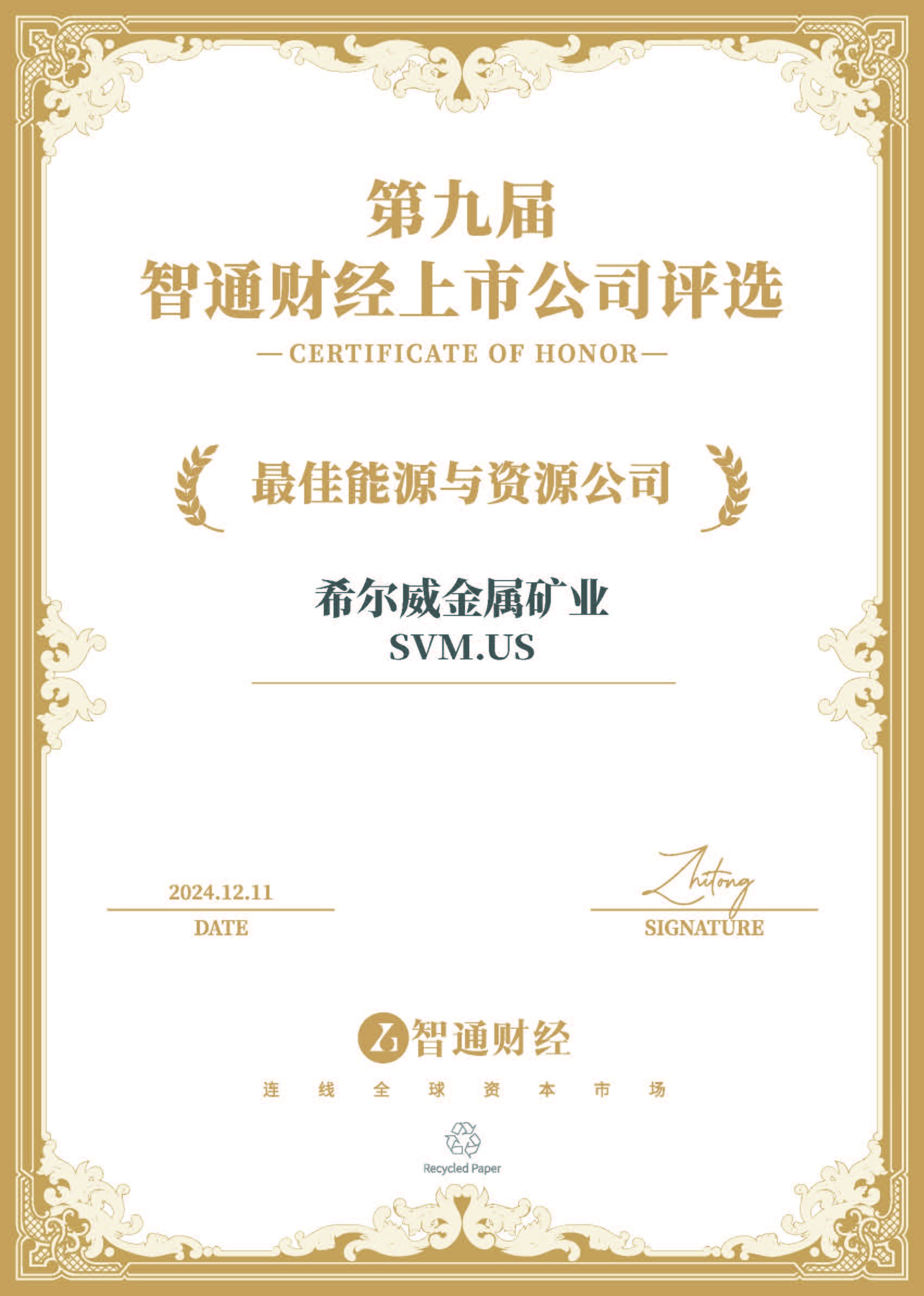 2024年12月11日,希尔威金属矿业(SVM.US)在备受瞩目的“第九届智通财经资本市场年会暨上市公司颁奖典礼”上荣获“最佳能源与资源公司”。这一盛会由国内领先的港美股资讯平台智通财经与中资海外私募基金一站式服务平台新智基金网联合主办,并由财经公关综合服务提供商冬日暖阳Donova独家承办,同时得到了专业财经路演直播平台“大路演”提供的路演支持。