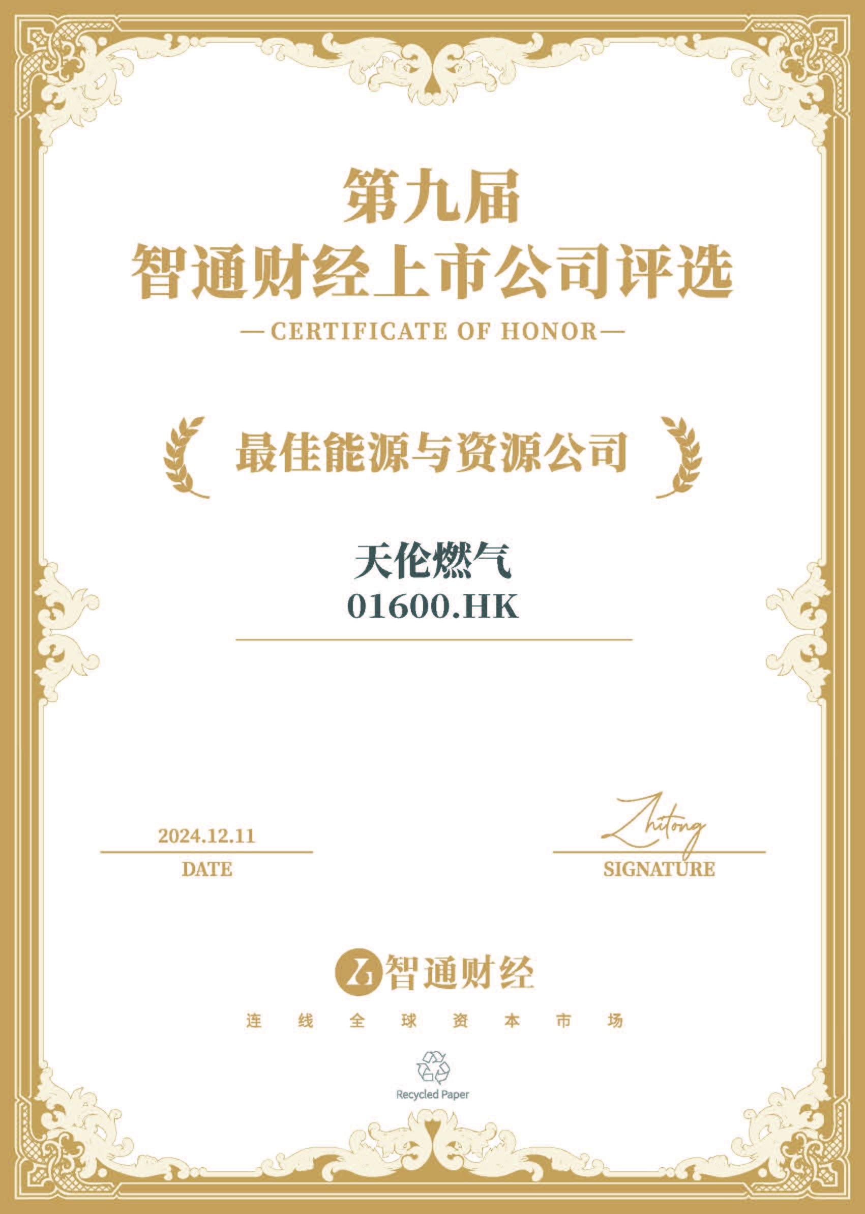 2024年12月11日,天伦燃气(01600)在备受瞩目的“第九届智通财经资本市场年会暨上市公司颁奖典礼”上荣获“最佳能源与资源公司”。这一盛会由国内领先的港美股资讯平台智通财经与中资海外私募基金一站式服务平台新智基金网联合主办,并由财经公关综合服务提供商冬日暖阳Donova独家承办,同时得到了专业财经路演直播平台“大路演”提供的路演支持。