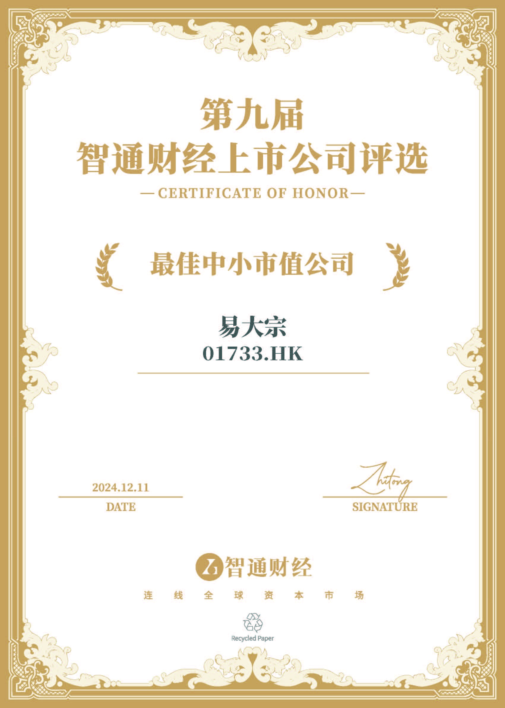“最佳中小市值公司”奖项,其主要表彰在中小市值股公司中,公司业务布局符合市场发展规律、当前经营态势良好、增长潜力巨大的港美股上市公司。易大宗的此次获奖,不仅彰显了业界和投资者的高度关注与认可,也是对公司极大的鼓励与鞭策。我们期待获奖上市公司再接再厉,为社会可持续发展与高质量增长贡献更多力量。