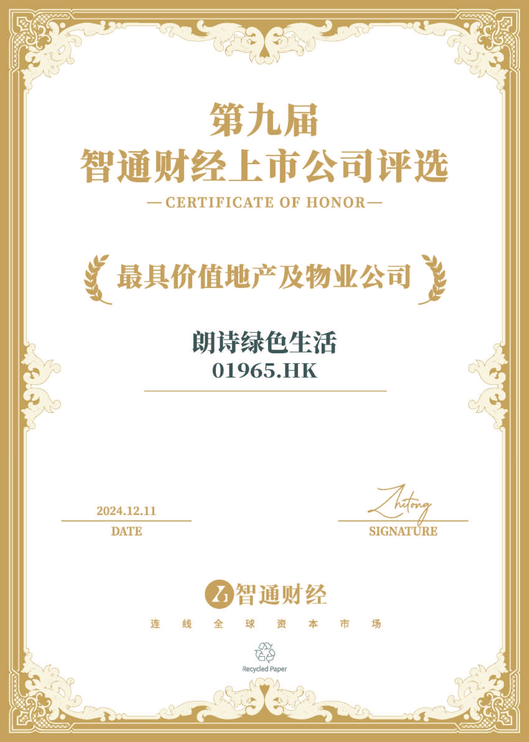 2024年12月11日,朗诗绿色生活(01965)在备受瞩目的“第九届智通财经资本市场年会暨上市公司颁奖典礼”上荣获“最具价值地产及物业公司”。这一盛会由国内领先的港美股资讯平台智通财经与中资海外私募基金一站式服务平台新智基金网联合主办,并由财经公关综合服务提供商冬日暖阳Donova独家承办,同时得到了专业财经路演直播平台“大路演”提供的路演支持。
