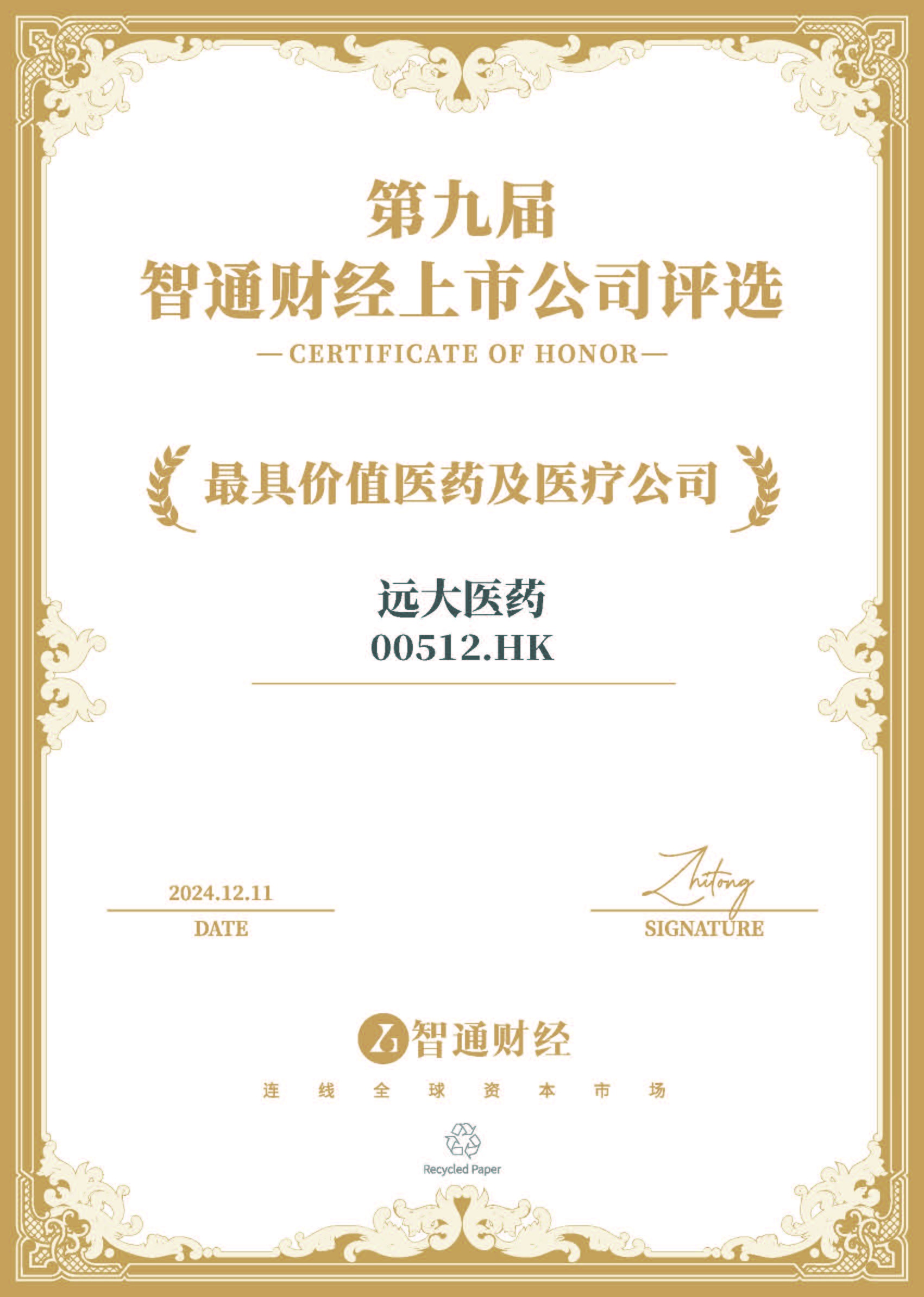 2024年12月11日,远大医药(00512)在备受瞩目的“第九届智通财经资本市场年会暨上市公司颁奖典礼”上荣获“最具价值医药及医疗公司”。这一盛会由国内领先的港美股资讯平台智通财经与中资海外私募基金一站式服务平台新智基金网联合主办,并由财经公关综合服务提供商冬日暖阳Donova独家承办,同时得到了专业财经路演直播平台“大路演”提供的路演支持。
