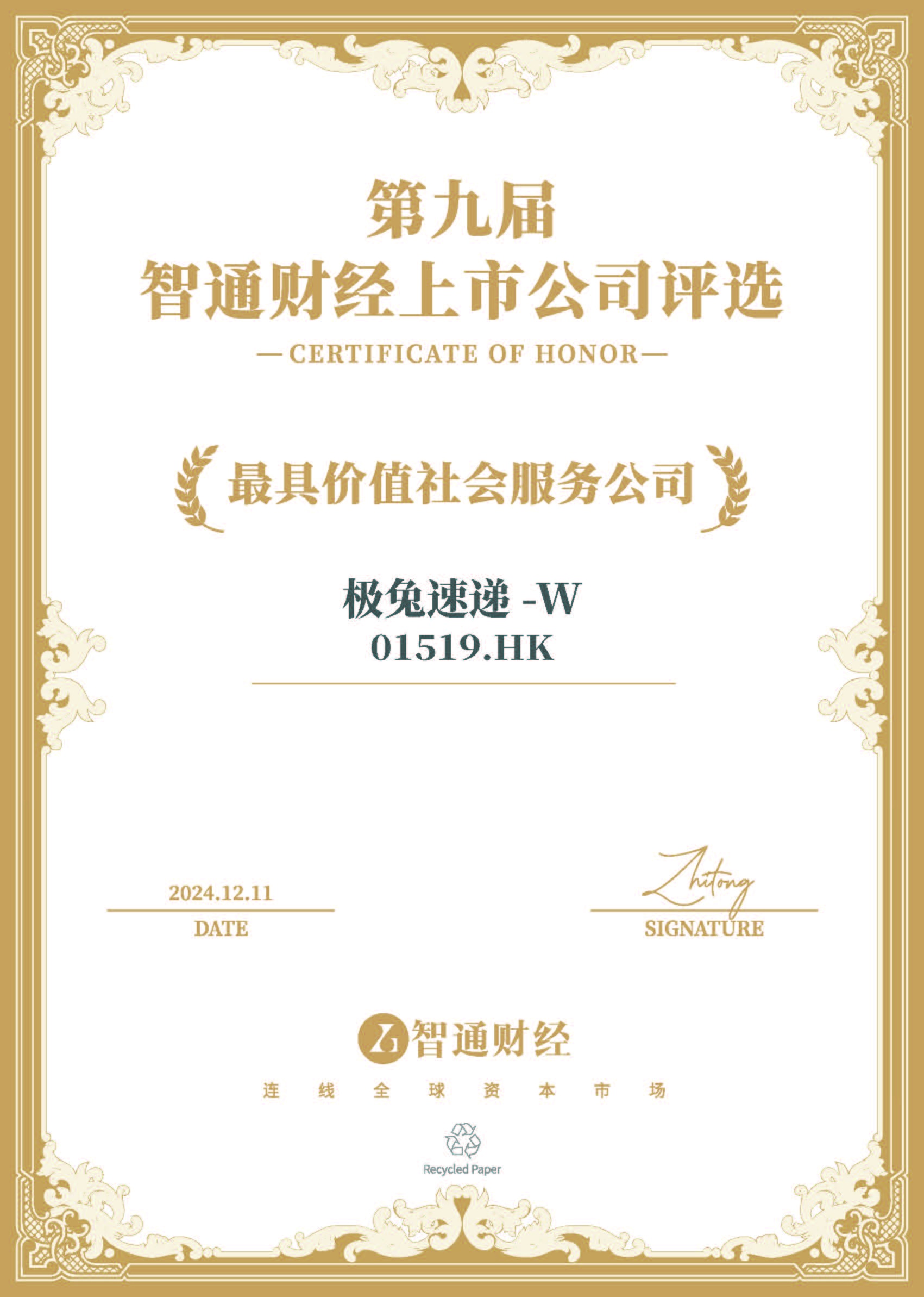 “最具价值社会服务公司”奖项,其主要表彰公司以人为本,为有需要的人群提供社会福利服务,积极履行社会使命和社会责任,能为投资者提供持续、稳定价值回报的社会服务港美股上市公司。极兔速递-W的此次获奖,不仅彰显了业界和投资者的高度关注与认可,也是对公司极大的鼓励与鞭策。我们期待获奖上市公司再接再厉,为社会可持续发展与高质量增长贡献更多力量。