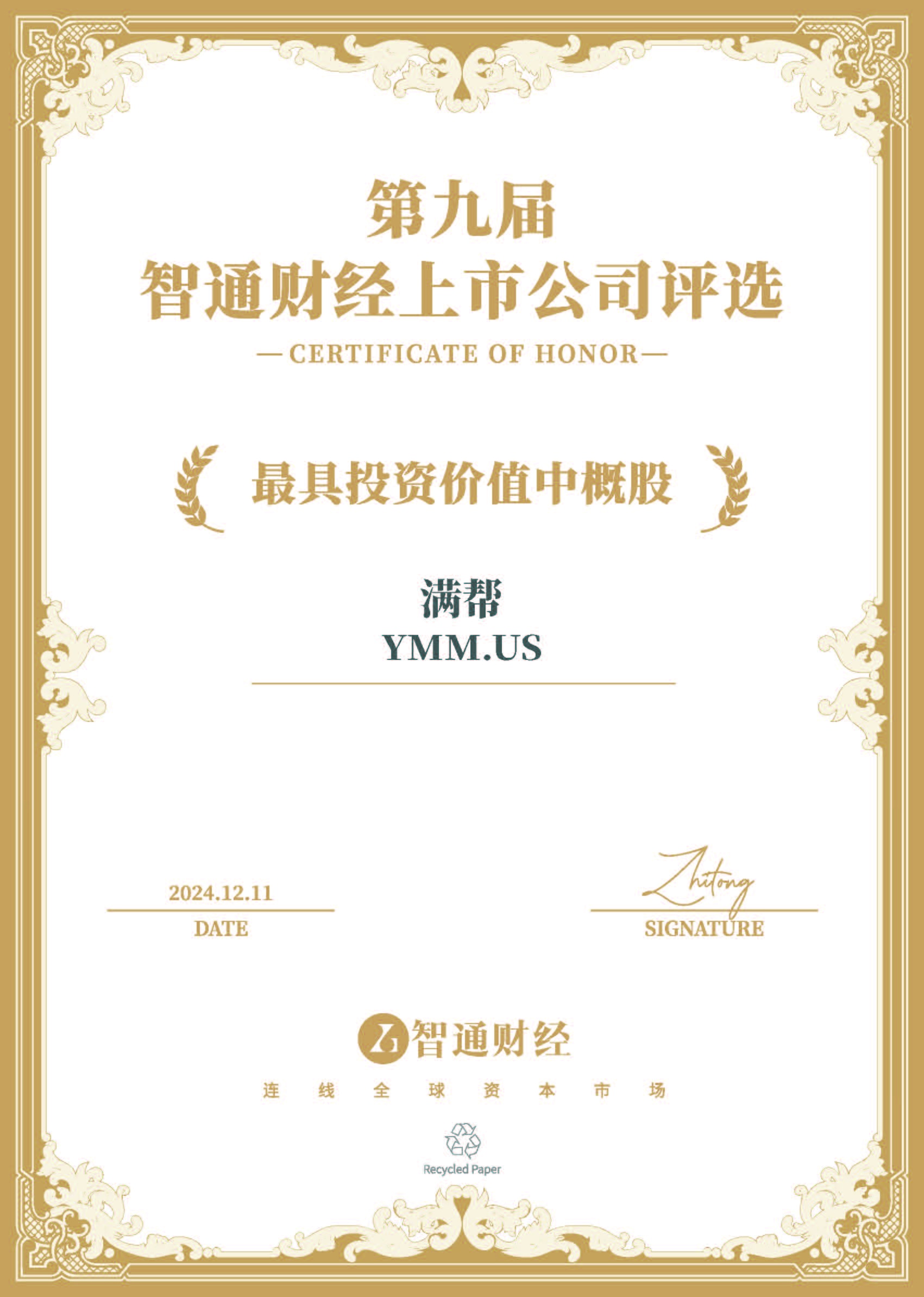2024年12月11日,满帮(YMM.US)在备受瞩目的“第九届智通财经资本市场年会暨上市公司颁奖典礼”上荣获“最具投资价值中概股”。这一盛会由国内领先的港美股资讯平台智通财经与中资海外私募基金一站式服务平台新智基金网联合主办,并由财经公关综合服务提供商冬日暖阳Donova独家承办,同时得到了专业财经路演直播平台“大路演”提供的路演支持。