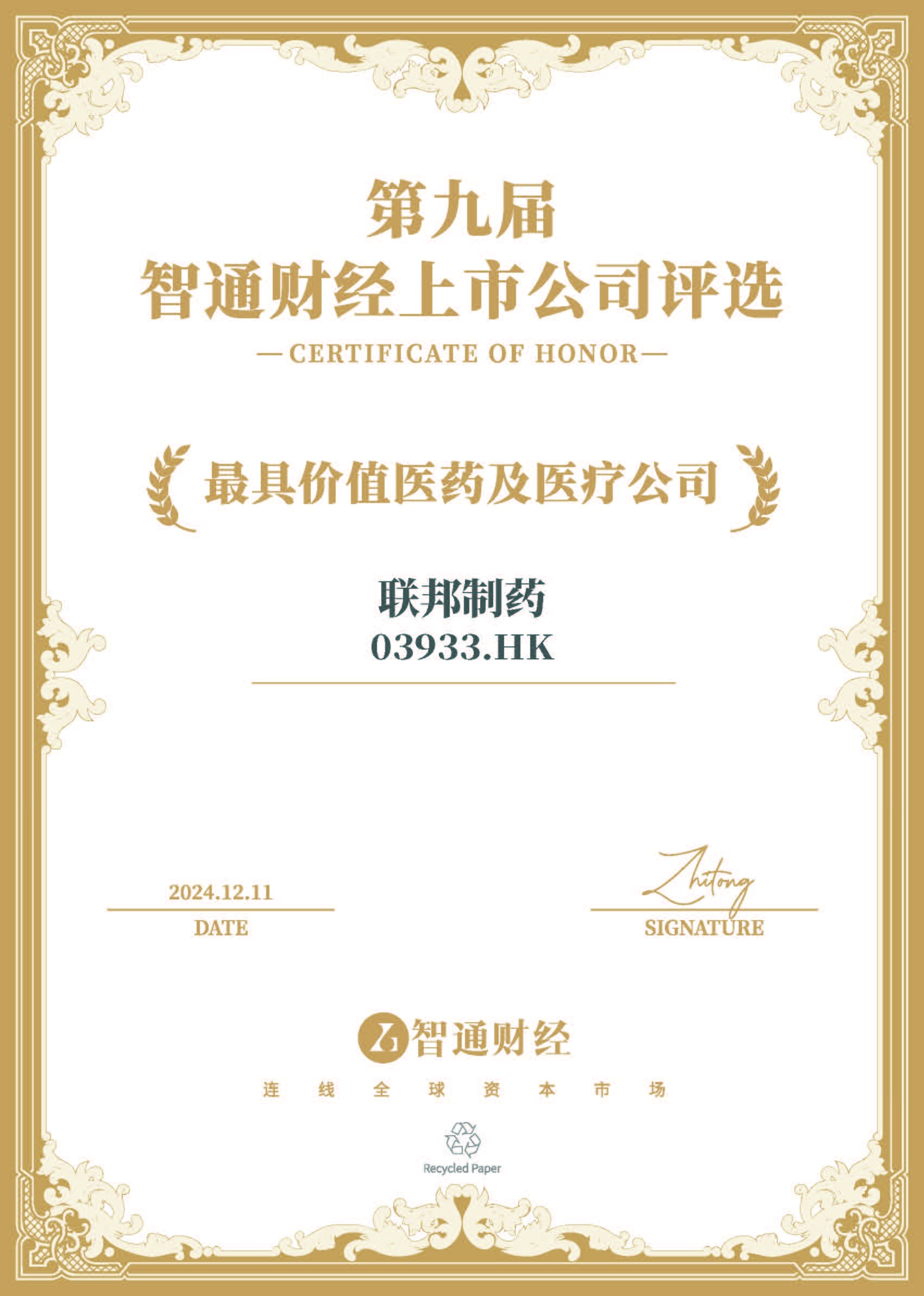 2024年12月11日,联邦制药(03933)在备受瞩目的“第九届智通财经资本市场年会暨上市公司颁奖典礼”上荣获“最具价值医药及医疗公司”。这一盛会由国内领先的港美股资讯平台智通财经与中资海外私募基金一站式服务平台新智基金网联合主办,并由财经公关综合服务提供商冬日暖阳Donova独家承办,同时得到了专业财经路演直播平台“大路演”提供的路演支持。