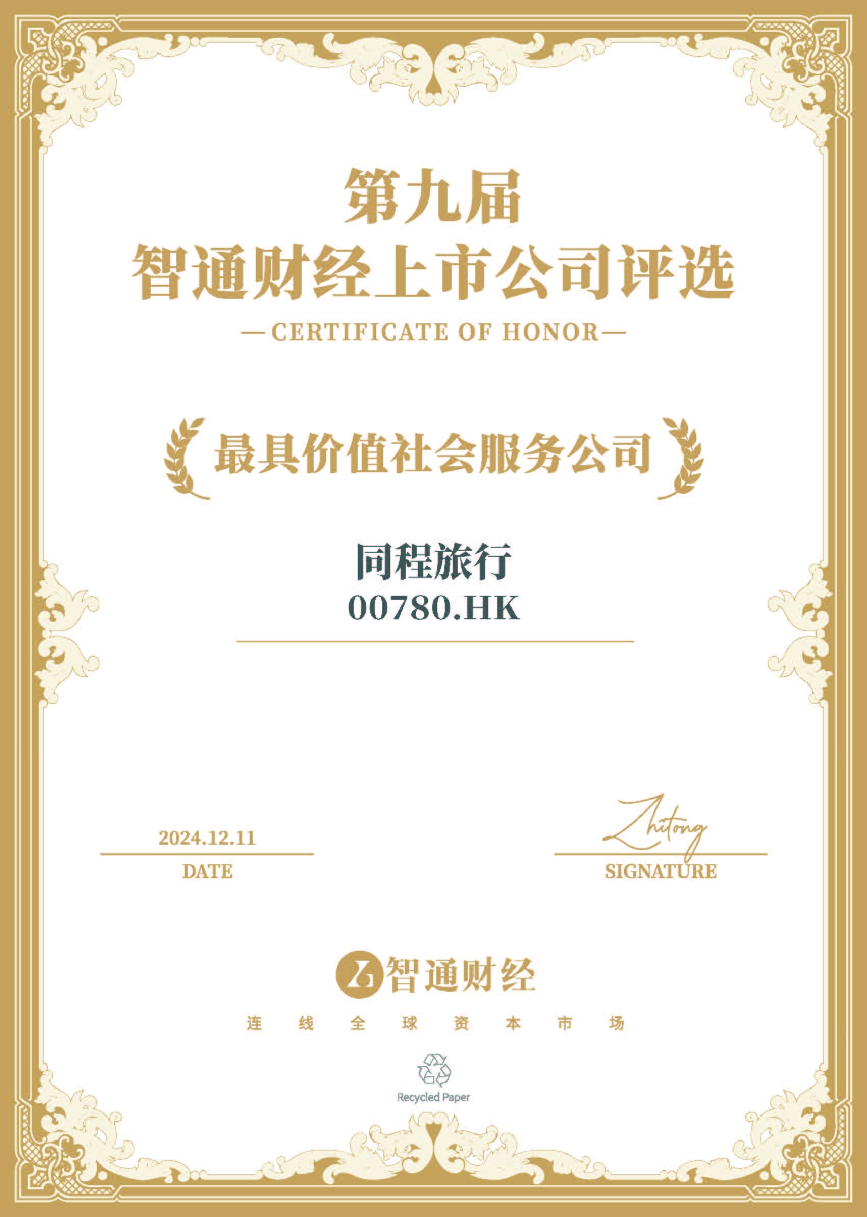 2024年12月11日,同程旅行(00780)在备受瞩目的“第九届智通财经资本市场年会暨上市公司颁奖典礼”上荣获“最具价值社会服务公司”。这一盛会由国内领先的港美股资讯平台智通财经与中资海外私募基金一站式服务平台新智基金网联合主办,并由财经公关综合服务提供商冬日暖阳Donova独家承办,同时得到了专业财经路演直播平台“大路演”提供的路演支持。
