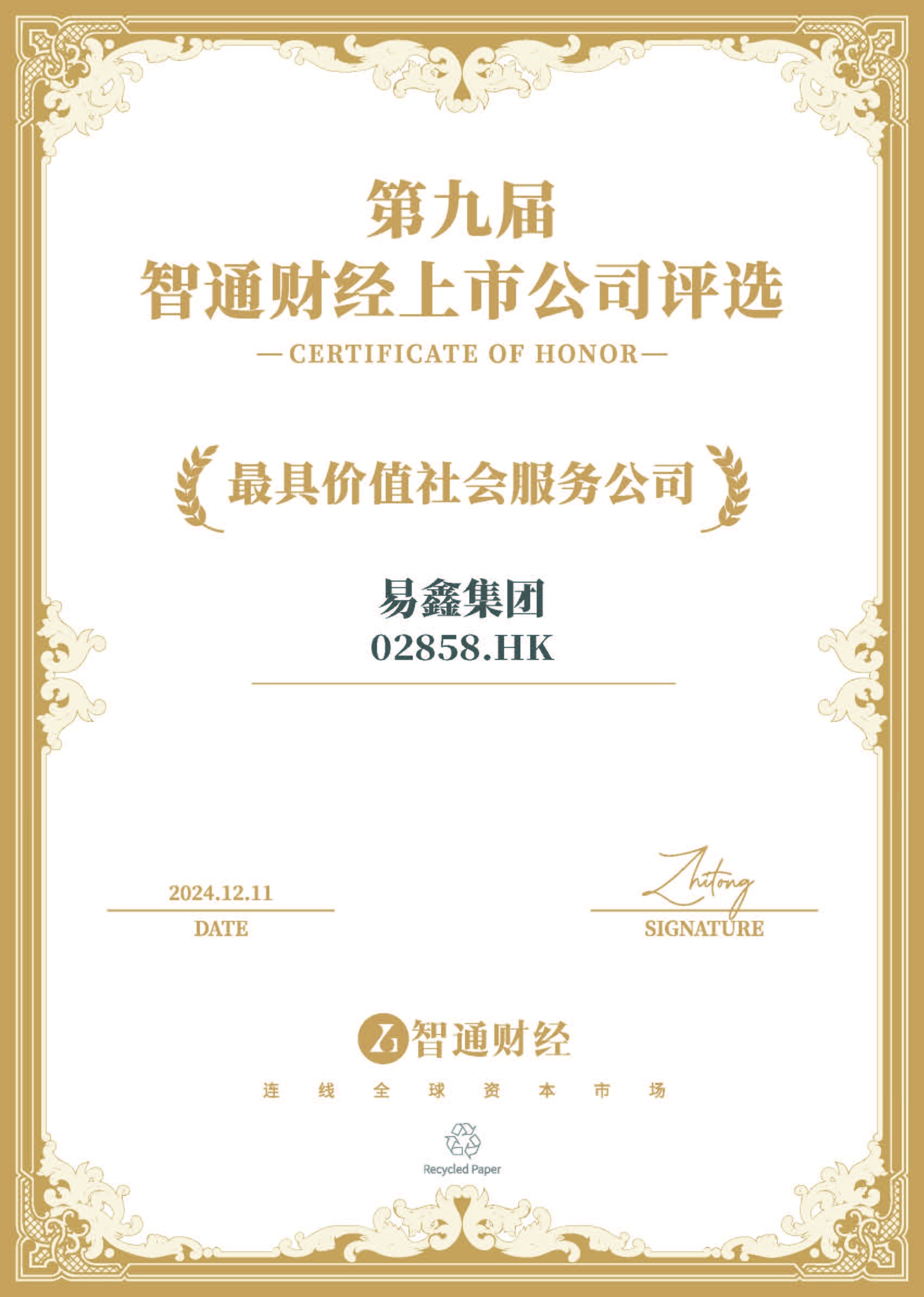 “最具价值社会服务公司”奖项,其主要表彰公司以人为本,为有需要的人群提供社会福利服务,积极履行社会使命和社会责任,能为投资者提供持续、稳定价值回报的社会服务港美股上市公司。易鑫集团的此次获奖,不仅彰显了业界和投资者的高度关注与认可,也是对公司极大的鼓励与鞭策。我们期待获奖上市公司再接再厉,为社会可持续发展与高质量增长贡献更多力量。