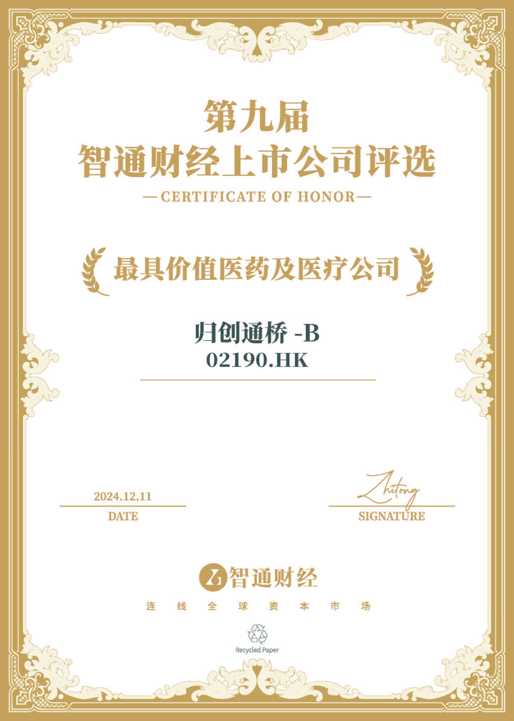 “最具价值医药及医疗公司”奖项,其主要表彰公司治理结构健康、行业地位显著、主营业务良好,能为投资者提供持续、稳定价值回报的医药及医疗类港美股上市公司。归创通桥-B的此次获奖,不仅彰显了业界和投资者的高度关注与认可,也是对公司极大的鼓励与鞭策。我们期待获奖上市公司再接再厉,为社会可持续发展与高质量增长贡献更多力量。