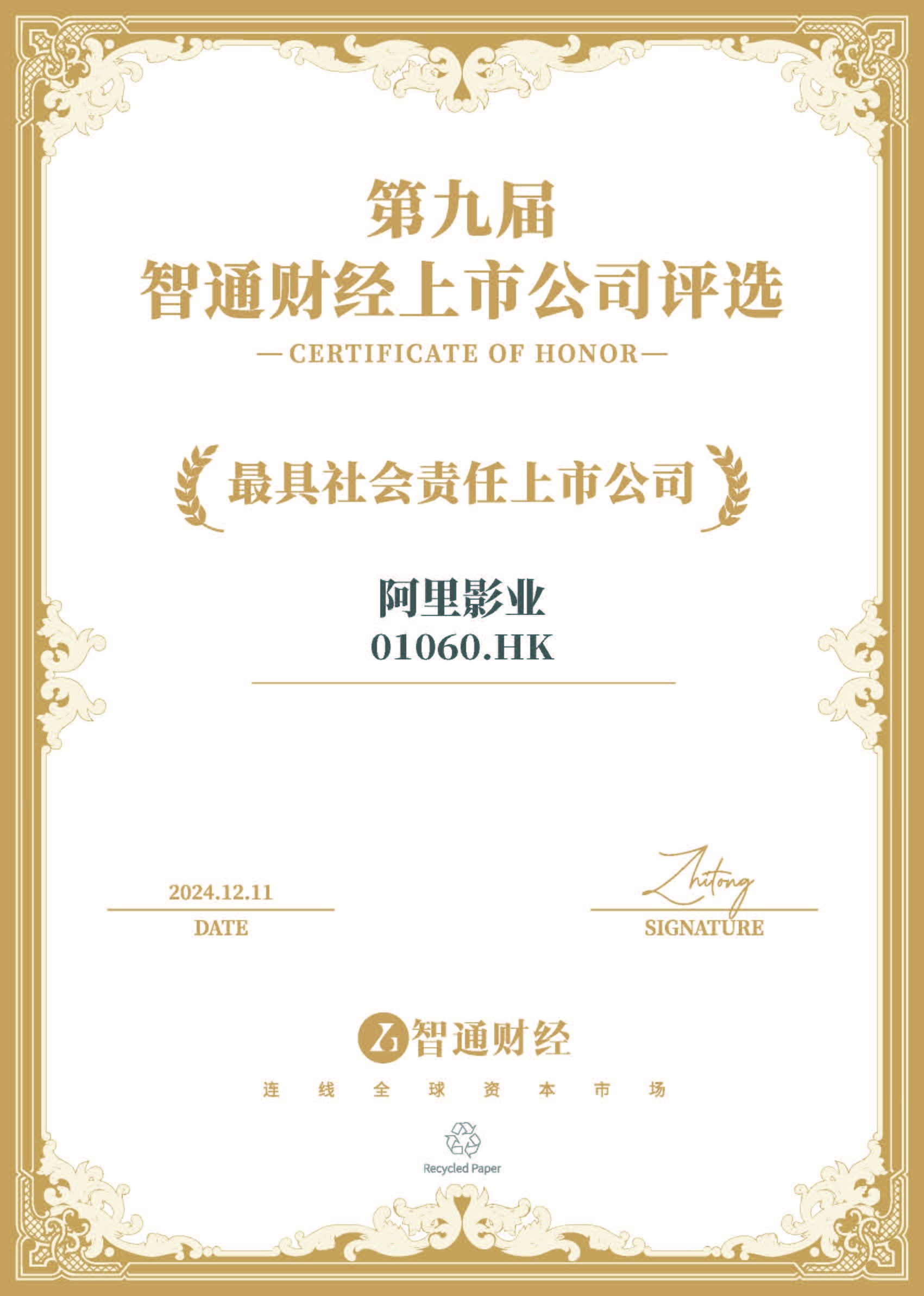 2024年12月11日,阿里影业(01060)在备受瞩目的“第九届智通财经资本市场年会暨上市公司颁奖典礼”上荣获“最具社会责任上市公司”。这一盛会由国内领先的港美股资讯平台智通财经与中资海外私募基金一站式服务平台新智基金网联合主办,并由财经公关综合服务提供商冬日暖阳Donova独家承办,同时得到了专业财经路演直播平台“大路演”提供的路演支持。