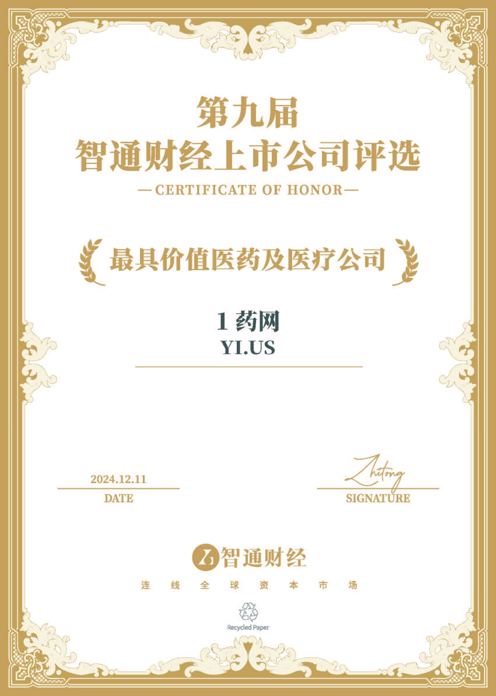 2024年12月11日,1药网(YI.US)在备受瞩目的“第九届智通财经资本市场年会暨上市公司颁奖典礼”上荣获“最具价值医药及医疗公司”。这一盛会由国内领先的港美股资讯平台智通财经与中资海外私募基金一站式服务平台新智基金网联合主办,并由财经公关综合服务提供商冬日暖阳Donova独家承办,同时得到了专业财经路演直播平台“大路演”提供的路演支持。