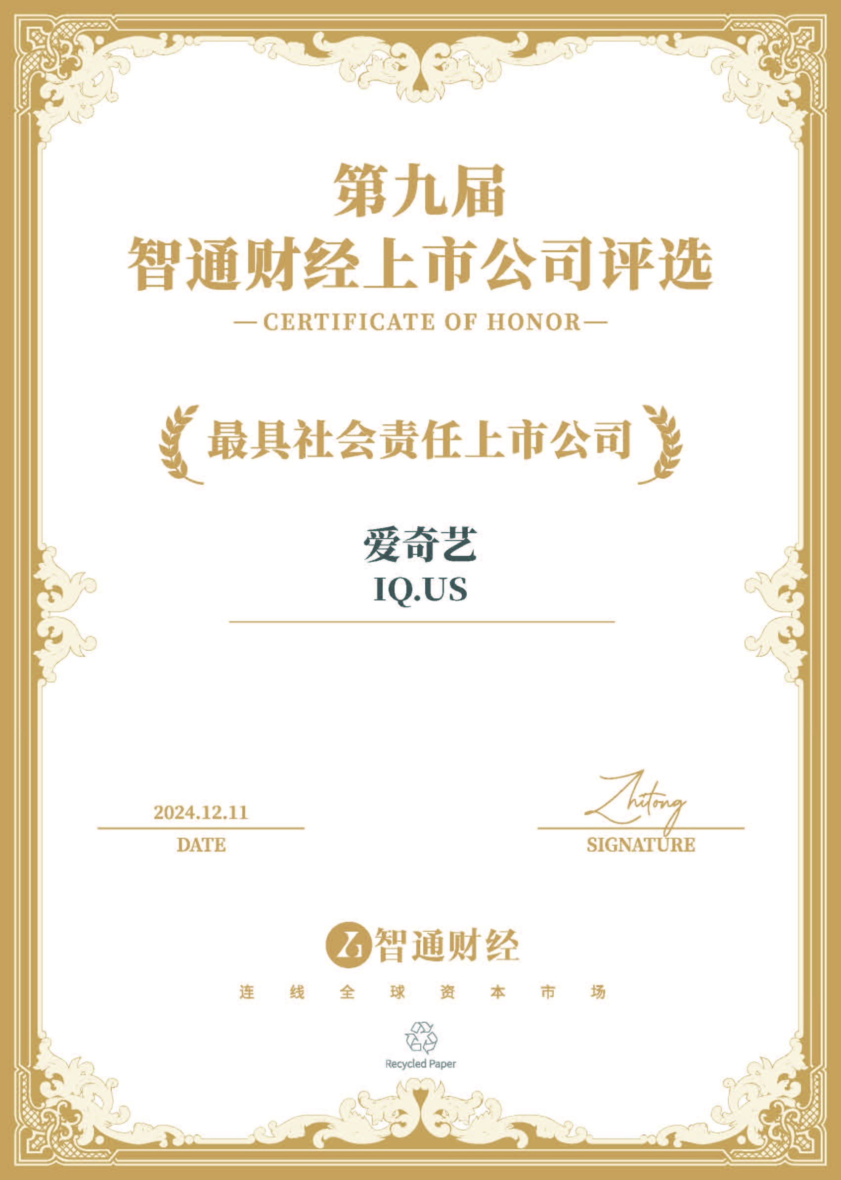 2024年12月11日,爱奇艺(IQ.US)在备受瞩目的“第九届智通财经资本市场年会暨上市公司颁奖典礼”上荣获“最具社会责任上市公司”。这一盛会由国内领先的港美股资讯平台智通财经与中资海外私募基金一站式服务平台新智基金网联合主办,并由财经公关综合服务提供商冬日暖阳Donova独家承办,同时得到了专业财经路演直播平台“大路演”提供的路演支持。