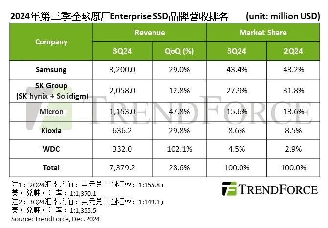 排名第二的SK Group(SK集团,含SK hynix 与Solidigm)凭借全系列满足AI储存需求产品,于第三季再创出货新高,带动Enterprise SSD营收达20.58亿美元。第四季由于新一代采用SK 176层TLC PCIe 5.0产品量产,加上原有Solidigm 144层TLC PCIe 4.0及大容量QLC SSD,SK海力士集团营收可望维持前一季水平。
